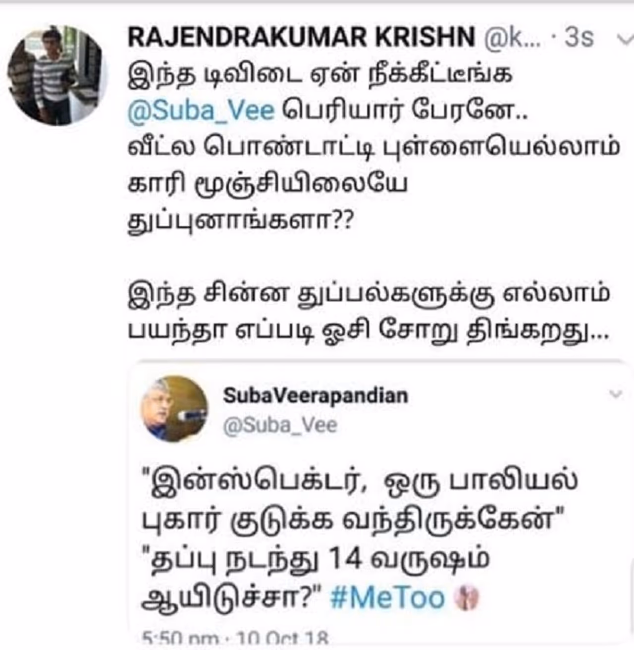 இதுகுறித்து தனது முகநூல் பக்கத்தில் ,’ இன்னுமா இந்த சுப.வீயையெல்லாம் நம்பிக்கொண்டிருக்கிறீர்கள். சுப.வீ.யும் தியாகுவும் தமிழ் தமிழர் இயக்கத்தில் பொதுச்செயலாளர், தலைவர் என ஒன்றாகப் பொழுதைப் போக்கிக்கொண்டிருந்தார்கள். தியாகு நடத்திய பாலியல் வக்கிரங்களுக்கெல்லாம் அன்னார் சுப.வீதான் சாட்சி. மறைப்பது, மாற்றுவது, திரிப்பது, தூற்றுவது எல்லாம் கைவந்த கலை இவர்கள் இரண்டு பேருக்கும்…
