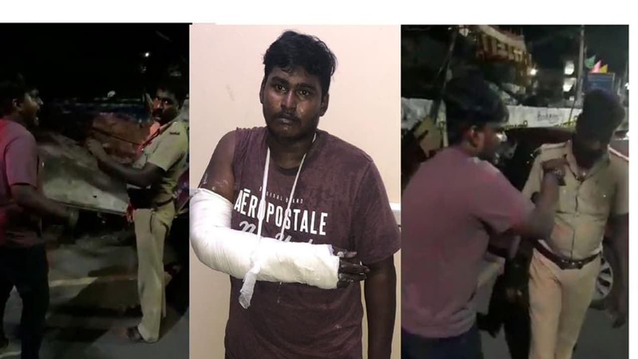 காலை சுமார் 6 மணிக்கு போதை தெளிந்து எழுந்த நம்ம ஹீரோ நான் எங்க இருக்கேன் என பேஷண்ட் , ஹேங் ஓவரில் எழுந்தார், நம்ம ஹீரோவின் கண்விழிப்புக்காக தயாராக இருந்த போ\லீசார் லாக்கப்பில் வைத்து கும்மாங்குத்து குத்தியியுள்ளனர். எதற்காக அடி வாங்குகிறோம் என்பது கூட தெரியாத இந்த பச்ச மண்ணை ரவுண்டுகட்டி, மாத்து மாத்துனு மாத்தியுள்ளனர். அப்போது அங்கு தயாராக இதை மாவுக்கட்டு போடும் வைத்தியரை வைத்து உடைந்த கையை கட்டு போட்டு போட்டோ எடுத்து வெளியிட்டுள்ளனர்.