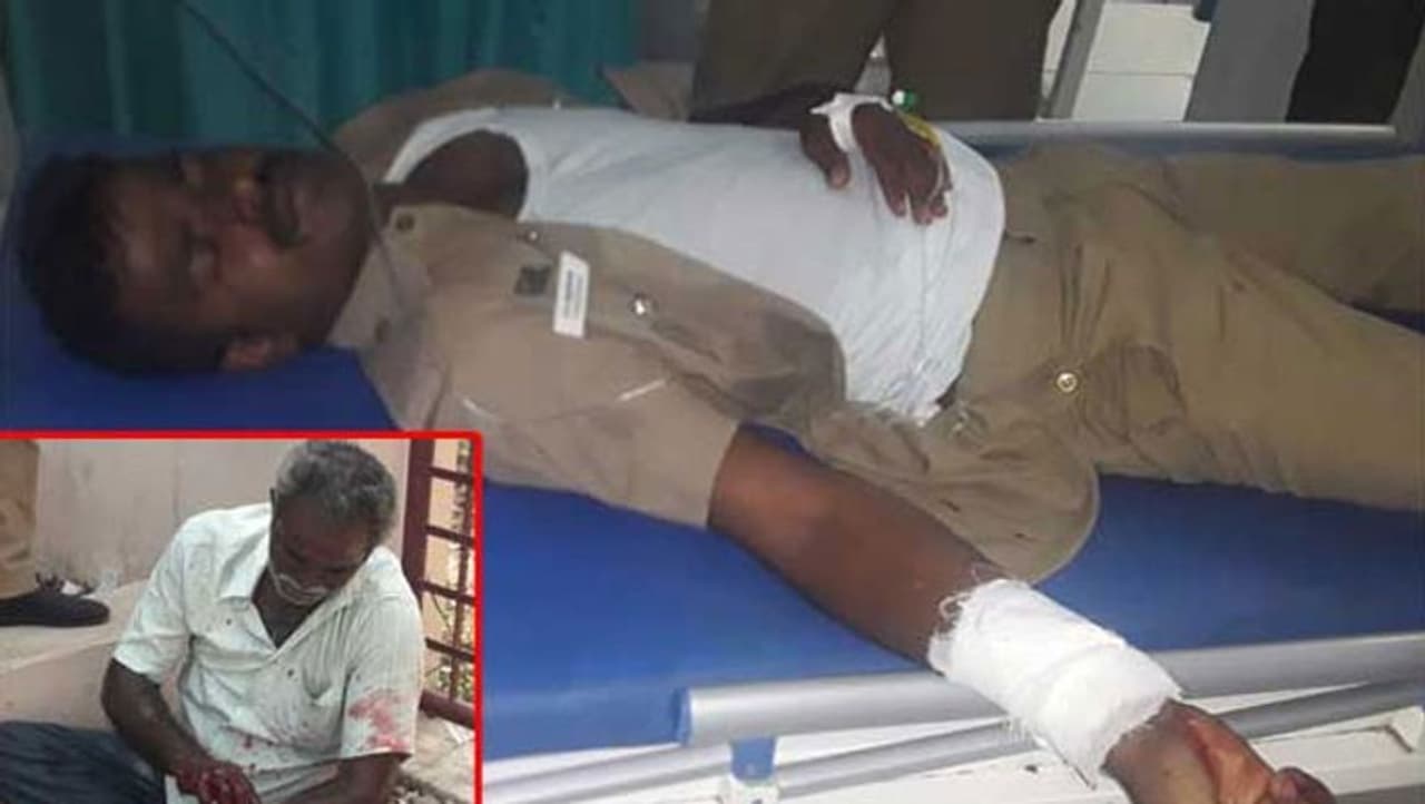 அப்போது, நீதிமன்ற வளாகத்திற்கு வந்த சுதாவை எதிர்பாராத விதமாக காமராஜ் தான் மறைத்து வைத்திருந்த கத்தியை எடுத்து சரமாரியாக வெட்டினார். இதில், ரத்த வெள்ளத்தில் சரிந்த சுதா மயங்கினார். இதனை பார்த்த நீதிமன்ற வளாக பாதுகாப்பு பணியில் இருந்த பெரம்பலூர் ஆயுதப்படை போலீஸ்காரர் அழகேசன் (29) ஓடிச்சென்று காமராஜ் கையில் வைத்திருந்த கத்தியை பறிக்கும் போது, அழகேசனின் வலது கை மணிக்கட்டு அருகே கத்தி கீறியதில் அவருக்கு ரத்தம் கொட்டியது. இருந்தாலும் ரத்த காயத்துடன் காமராஜை பிடித்து வைத்திருந்தார். அதே போல் காமராஜ் இடது கையிலும் காயம் ஏற்பட்டது. இதை பார்த்த பாதுகாப்பு பணியில் இருந்த போலீசார் காயம் அடைந்த இருவரையும் பெரம்பலூர் அரசு தலைமை மருத்துவமனைக்கு அனுப்பி வைத்தனர். அங்கு இருவரும் தொடர்ந்து சிகிச்சை பெற்று வருகின்றனர். நீதிமன்ற வளாகத்தில் கத்தி குத்து சம்பவத்தால் அப்பகுதியில் பரபரப்பு ஏற்பட்டது.