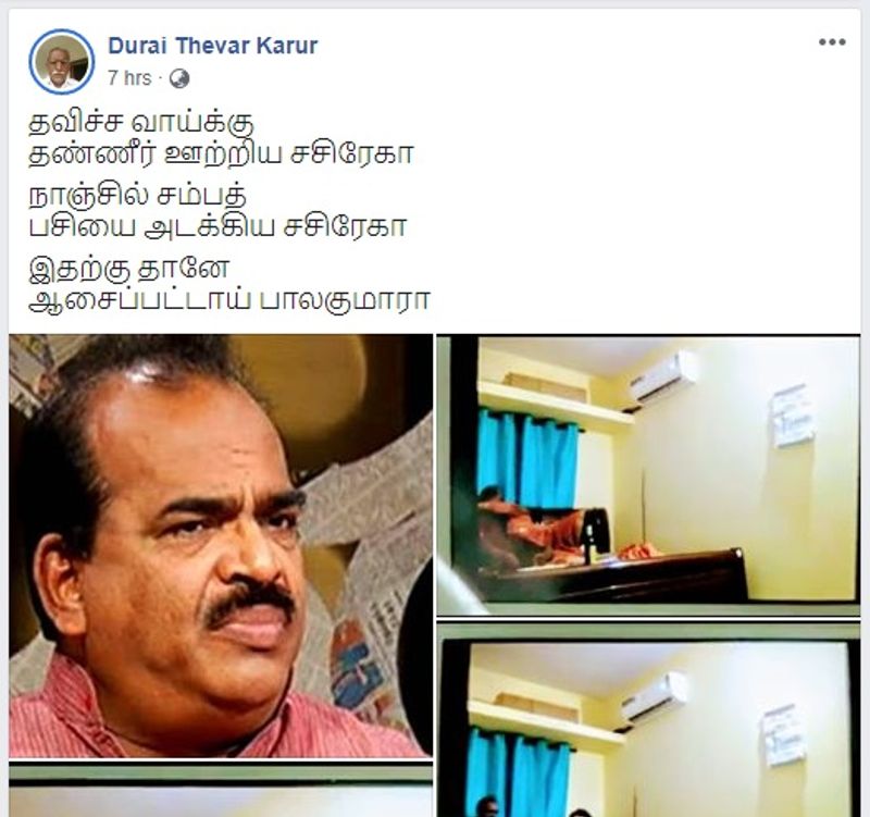 நாஞ்சி சம்பத்தின் இந்த கில்மா வீடியோவை அமமுக தீவிர பக்தர் ஒருவர் தனது முகநூல் பக்கத்தில் வெளியிட்டு, அடுக்கடுக்கான வசனம் எழுதியுள்ளார்.