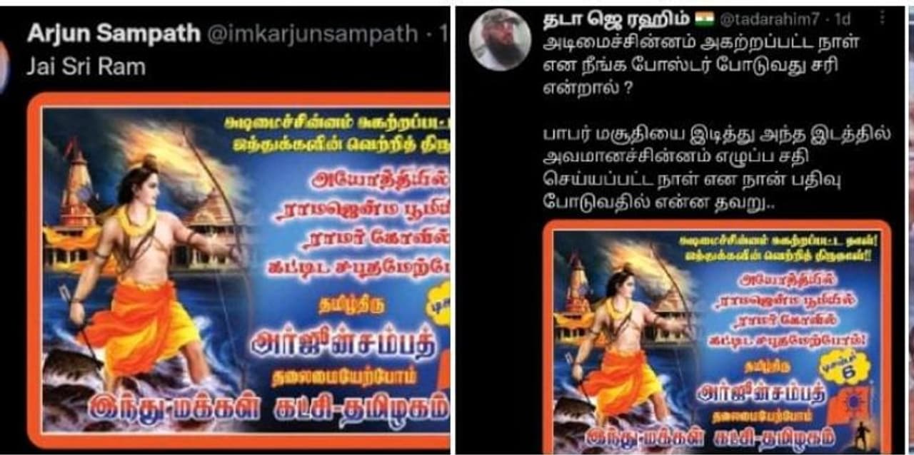 ரு பிரிவினரிடையே மோதலை ஏற்படுத்தும் விதமாக சர்ச்சைக்குரிய வகையில் டிவிட்டரில் கருத்து பதிவிட்ட இந்து மக்கள் கட்சி தலைவர் அர்ஜுன் சம்பத் மீதும் அதற்கு பதில் அளித்து பதிவிட்ட தடா ரஹீம் மீதும் போலீசார் தனித்தனியாக வழக்கு பதிவு செய்துள்ளனர்.