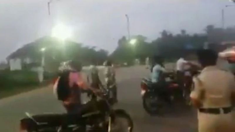 அப்போது ஹெல்மெட் அணியாமல் சென்ற பிரியாவின் இருசக்கர வாகனத்தை கம்பால் தடுக்க முயன்றார். இதனால் பிரியா, திடீரென பிரேக் பிடித்து நிறுத்தினார்.