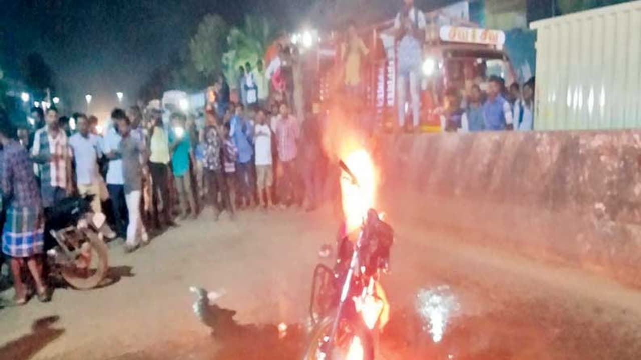 இதற்கிடையில் பிரியா கீழே விழுந்ததற்கு போலீசாரே காரணம் என்று கூறி, அந்த பகுதியை சேர்ந்த பொதுமக்கள், செங்குன்றம்-திருவள்ளூர் நெடுஞ்சாலையில் அதே இடத்தில் சாலை மறியலில் ஈடுபட்டனர். அப்போது அங்கு நிறுத்தி இருந்த ஊர்க்காவல் படை வீரரின் மோட்டார் சைக்கிளை அடித்து நொறுக்கியதுடன் பெட்ரோல் ஊற்றியும் எரித்தனர்.