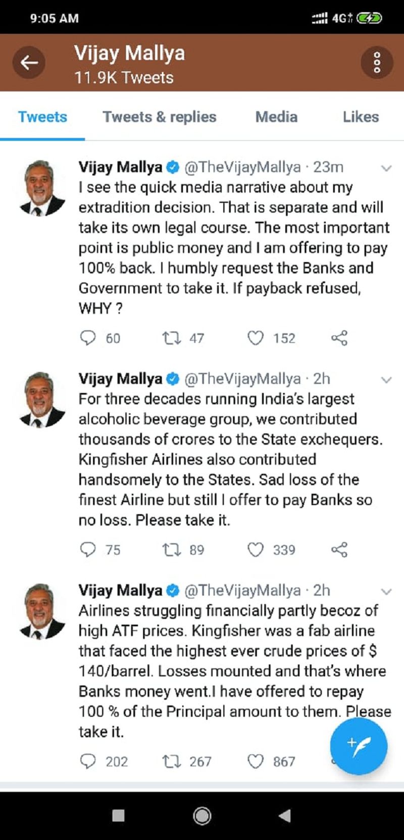 இதனிடையே விஜய் மல்லையா இன்று தனது டுவிட்டர் பக்கத்தில் தான் பெற்ற கடன்களை 100 சதவீதம் திரப்பித் தர தயாராக உள்ளதாக தெரிவித்துள்ளார். அதில் மது தொழிற்சாலைகள் மற்றும் கிங் ஃபிஷர் ஏர்லைன்ஸ் நிறுவனங்களில் ஏற்பட்ட கடும் இழப்பு காரணமாக தான் வங்கிகளில் பெற்ற கடன்களை திருப்பிச் செலுத்த முடியாமல் போனதாகவும் அவர் குறிப்பிட்டுள்ளார்.