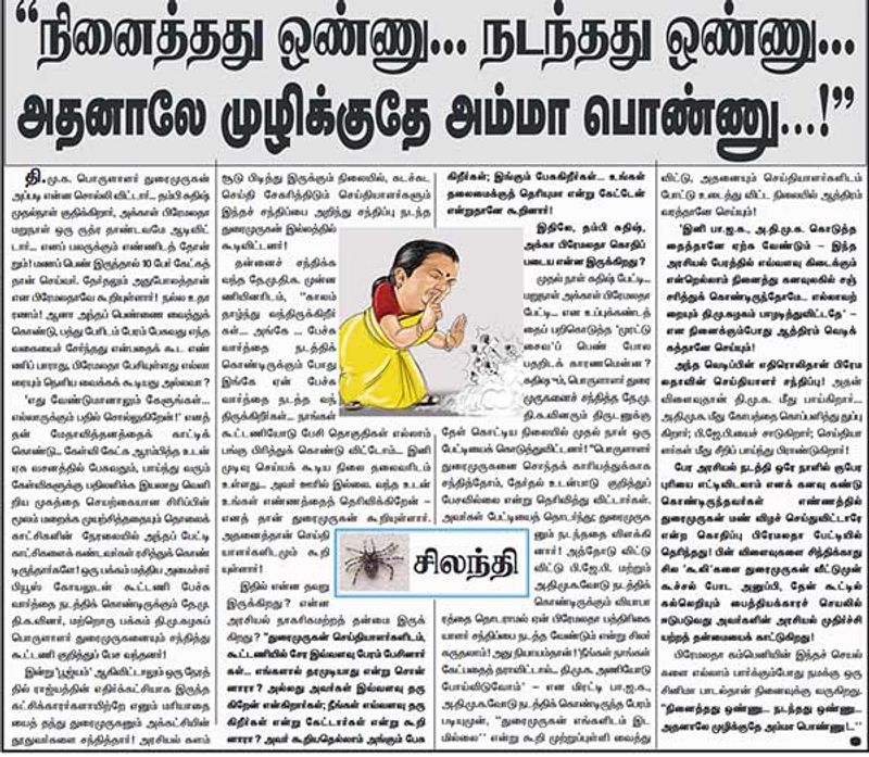 பேர அரசியல் நடத்தி ஒரே நாளில் குபேரனாக எனக் கனவு கண்டு கொண்டிருந்தவர்கள் எண்ணத்தில் துரைமுருகன் மண் விழச் செய்துவிட்டாரே என திமுகவின் ஆதரவு பத்திரிகையான முரசொலி கிழித்து தொங்க விட்டிருக்கிறது. அதிமுக பிஜேபி கூட்டணிக்கு அடிபோட்டுக்கொண்டிருக்கும் அதே வேளையில், திமுகவில் தூது விட்டு முக்குடைபட்டதால் காண்டான பிரேமலதா, சுதீஷ் கொந்தளித்து தள்ளியதால் வெளுத்து வாங்கியிருக்கிறது முரசொலி.