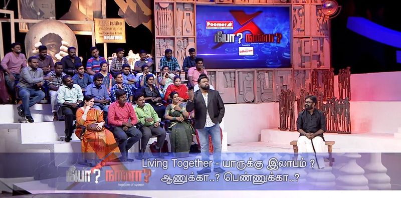 நிகழ்ச்சியை நடத்திய கோபிநாத்தும் லிவிங் டுகதருக்காக பேசிய ஒருவரிடம் உங்கள் காதலி பெயரைச் சொல்லமுடியுமா என்று கேள்வி எழுப்பினார். தன் மகன் லிவிங் டுகதர் உறவில் இருக்கிறான் என்பதைச் சொன்ன ஒரு தாயிடம் உங்கள் மகள் அப்படி இருந்தால் ஏற்றுக் கொள்வீர்களா..? என்றெல்லாம் கேள்வி எழுப்பினார். இது முழுக்க ஒருபக்க சாய்வாகவே பட்டது. (அந்தப் பெண்மணி தன் மகனைப் பற்றிச் சொன்னதுமே உங்கள் ‘மருமகளின்’ பெற்றோர் மனநிலையை என்றைக்காவது அறிந்து கொள்ள முயற்சித்தீர்களா என்று கேட்டிருந்தால்கூட அவர் பெண்களுக்கு லிவிங் டுகதெர் எத்தகைய சிக்கலை உண்டாக்கும் என்று யோசித்ததாக புரிந்து கொள்ளலாம்.)