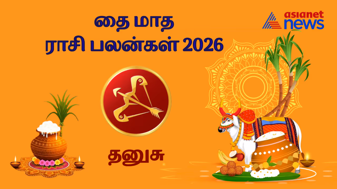 Thai Matha Rasi Palan 2026 Dhanusu: தனுசு ராசி நேயர்களே பிறக்க இருக்கும் தை மாதம் உங்களுக்கு சாதகமான பலன்களையும், சில பொறுப்புகளையும் வழங்க இருக்கிறது. மாதத் தொடக்கத்தில் ராசிநாதன் குரு பகவான் உங்கள் ராசியை பார்ப்பதால் எடுக்கும் காரியங்களில் வெற்றி கிடைக்கும். தினமும் நல்ல செய்திகள் வந்த வண்ணம் இருக்கும். தன ஸ்தானத்தில் சூரியன், சுக்கிரன், செவ்வாய், புதன் ஆகிய கிரகங்கள் இணைந்து சதுர்கிரக யோகத்தை உருவாக்குகின்றனர். எனவே பொருளாதார மேம்படும். கடன் பிரச்சினைகள் தீரும்.