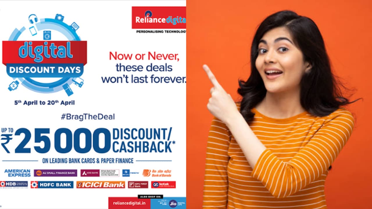 ரிலையன்ஸ் டிஜிட்டல் மீண்டும் ஒரு பெரிய சலுகையுடன் வாடிக்கையாளர்களை சந்திக்க வந்துள்ளது. ஏப்ரல் 5, 2025 முதல் 'டிஜிட்டல் தள்ளுபடி தினங்கள்' விற்பனையைத் தொடங்கியது. ஒவ்வொரு ஆண்டும் பண்டிகைகள், விடுமுறை நாட்களில் சலுகைகளை அறிவிக்கும் ரிலையன்ஸ் டிஜிட்டல், இப்போது கோடை விடுமுறையை முன்னிட்டு டிஜிட்டல் தள்ளுபடி தினங்கள் விற்பனையை அறிவித்துள்ளது.