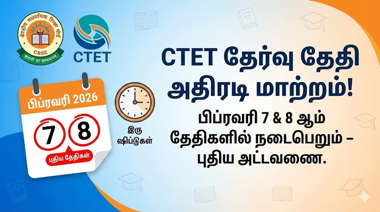 CTET சிபிஎஸ்இ சிடெட் பிப்ரவரி 2026 தேர்வு தேதிகள் மாற்றப்பட்டுள்ளன. அதிக விண்ணப்பங்கள் காரணமாக இப்போது தேர்வு இரண்டு நாட்கள் நடைபெறும். தாள் 1 மற்றும் தாள் 2-க்கான புதிய நேர அட்டவணை உள்ளே.