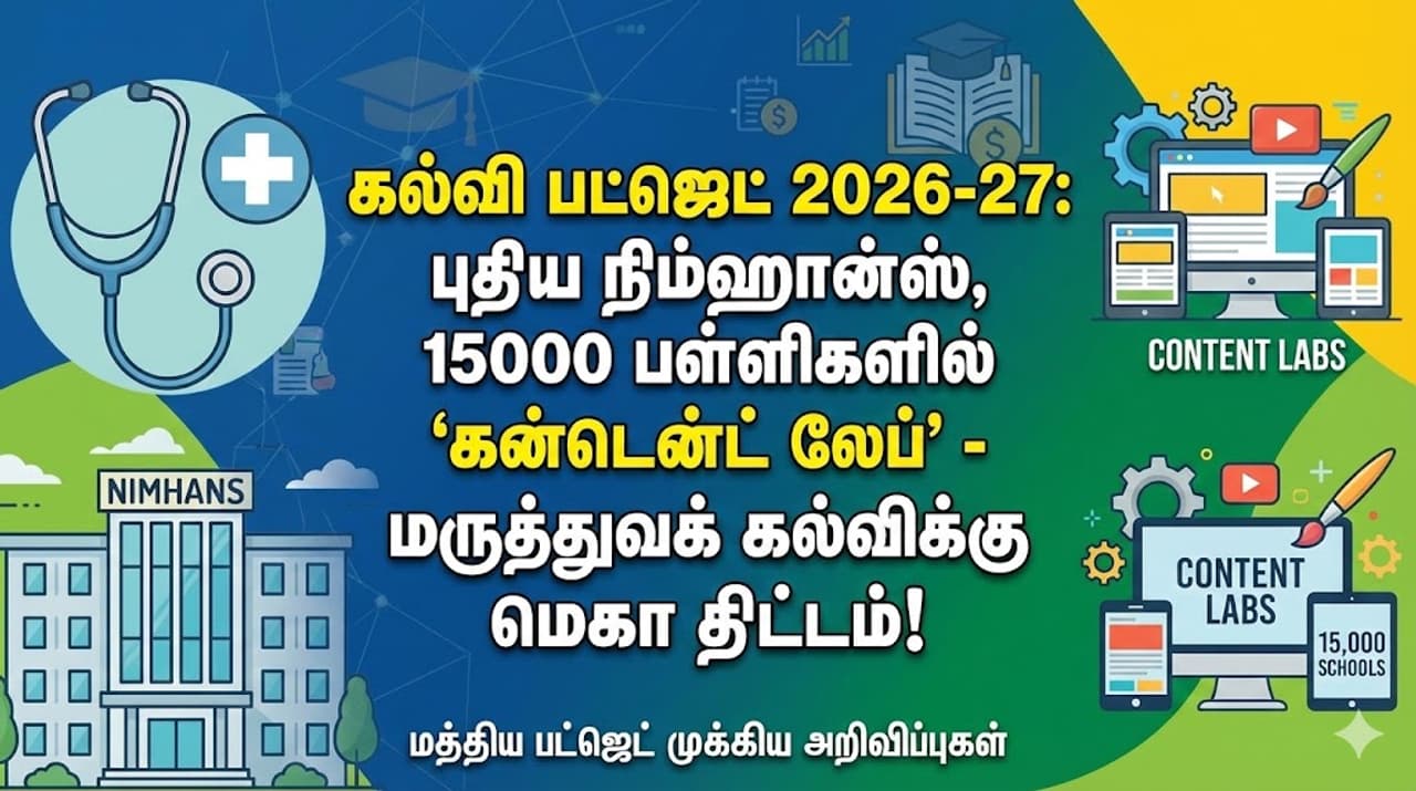 Budget 2026 கல்வி பட்ஜெட் 2026-27 சிறப்பம்சங்கள்: வட இந்தியாவில் புதிய நிம்ஹான்ஸ், 15,000 பள்ளிகளில் கன்டென்ட் லேப் மற்றும் மருத்துவக் கல்விக்கு ரூ.10,000 கோடி ஒதுக்கீடு.