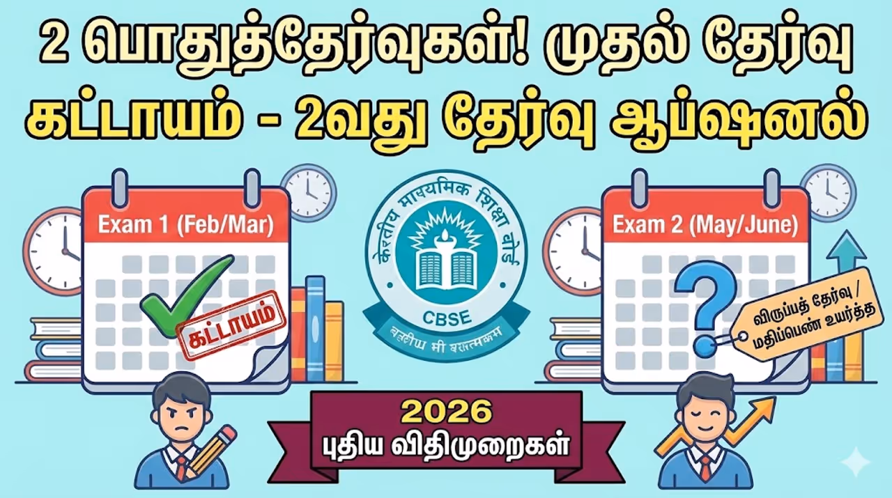 CBSE 2026-ல் சிபிஎஸ்இ 10-ம் வகுப்பு மாணவர்களுக்கு இரண்டு பொதுத்தேர்வுகள். முதல் தேர்வு கட்டாயம், இரண்டாவது மதிப்பெண் உயர்த்த மட்டுமே என அறிவிப்பு. முழு விவரம் இதோ.
