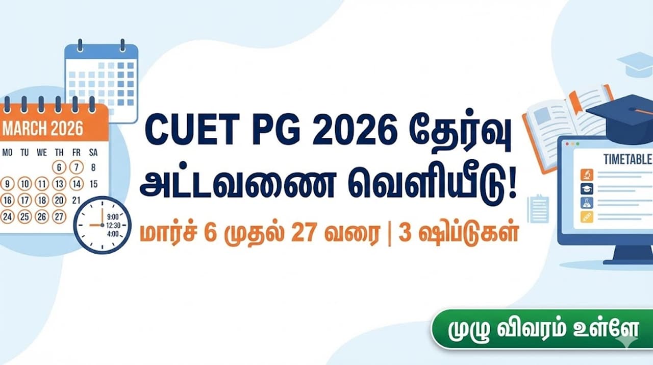 • முதுகலை மாணவர்களே ரெடியா? CUET PG தேர்வு தேதி வந்தாச்சு! டைம் டேபிள் இதோ