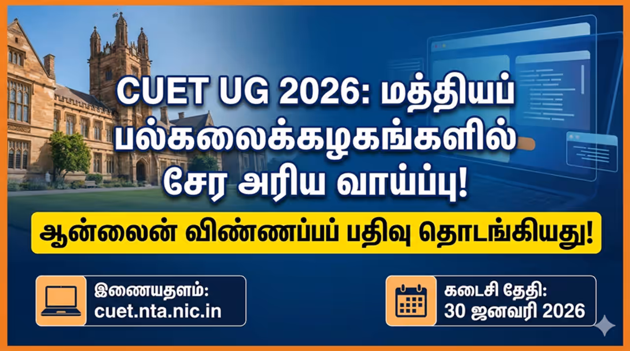 CUET UG 2026 விண்ணப்பப் பதிவு தொடங்கியது. ஜனவரி 30-க்குள் cuet.nta.nic.in தளத்தில் விண்ணப்பிக்கலாம். தேர்வு தேதி மற்றும் கட்டண விவரங்கள் உள்ளே.