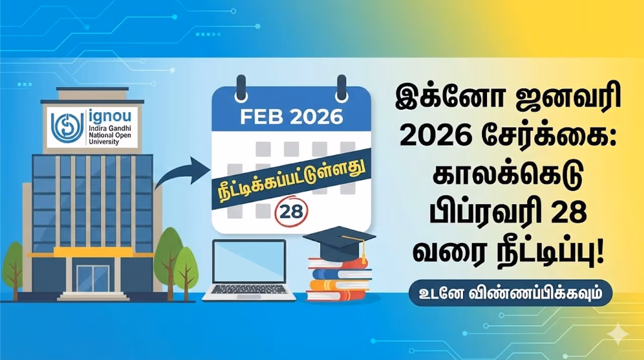 IGNOU extends the registration deadline for January 2026 ODL and Online programs to February 28. Apply now at ignouadmission.samarth.edu.in. இக்னோ ஜனவரி 2026 அமர்வுக்கான சேர்க்கை காலக்கெடு பிப்ரவரி 28 வரை நீட்டிக்கப்பட்டுள்ளது.