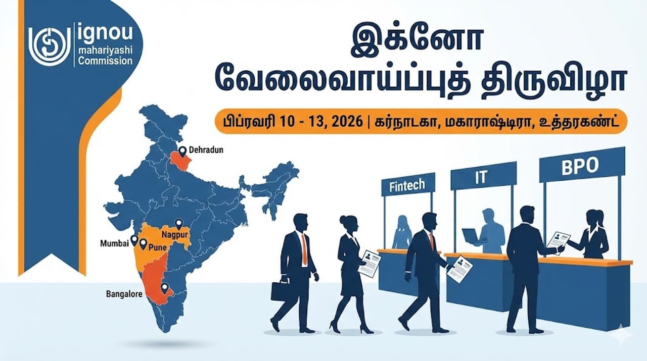 இந்திரா காந்தி தேசிய திறந்தநிலை பல்கலைக்கழகம் (IGNOU), தனது மாணவர்களுக்காக ஒரு பெரிய அளவிலான வேலைவாய்ப்பு முகாமை (Placement Drive) அறிவித்துள்ளது. பல்கலைக்கழகத்தின் 'கேம்பஸ் பிளேஸ்மென்ட் செல்' (CPC) மூலம் இந்த முகாம் ஏற்பாடு செய்யப்பட்டுள்ளது. கர்நாடகா, மகாராஷ்டிரா மற்றும் உத்தரகண்ட் ஆகிய மாநிலங்களில் உள்ள மாணவர்கள் மற்றும் முன்னாள் மாணவர்களை மையமாகக் கொண்டு இந்த வேலைவாய்ப்புத் திருவிழா நடைபெறவுள்ளது.