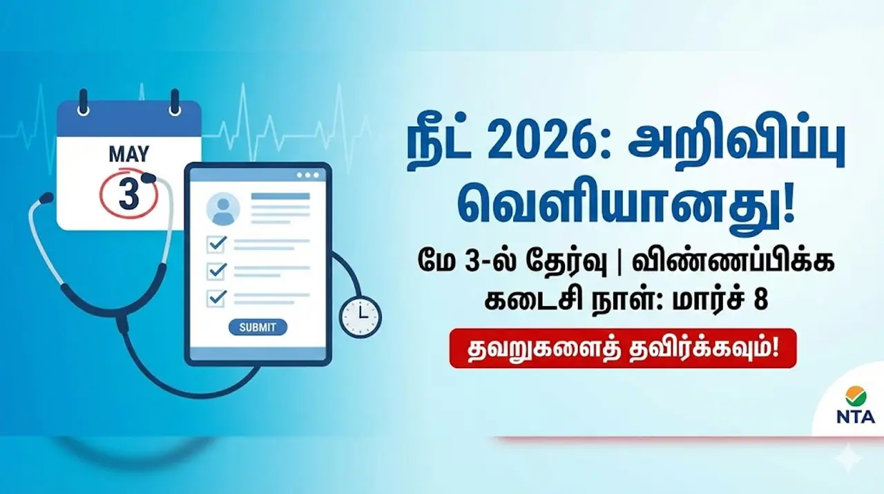 NEET நீட் 2026 தேர்வு அறிவிப்பு வெளியானது. விண்ணப்பிக்கும் முறை, கட்டணம் மற்றும் மாணவர்கள் தவிர்க்க வேண்டிய 7 முக்கிய தவறுகள் பற்றிய முழு விவரம் உள்ளே.