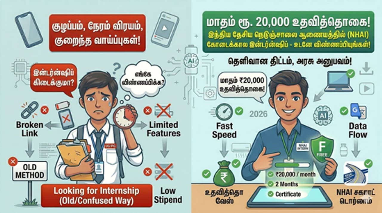 - படிக்கும்போதே மாதம் ₹20,000 சம்பாதிக்கலாம்! இந்திய தேசிய நெடுஞ்சாலை ஆணையத்தில் (NHAI) சூப்பர் இன்டர்ன்ஷிப் வாய்ப்பு!