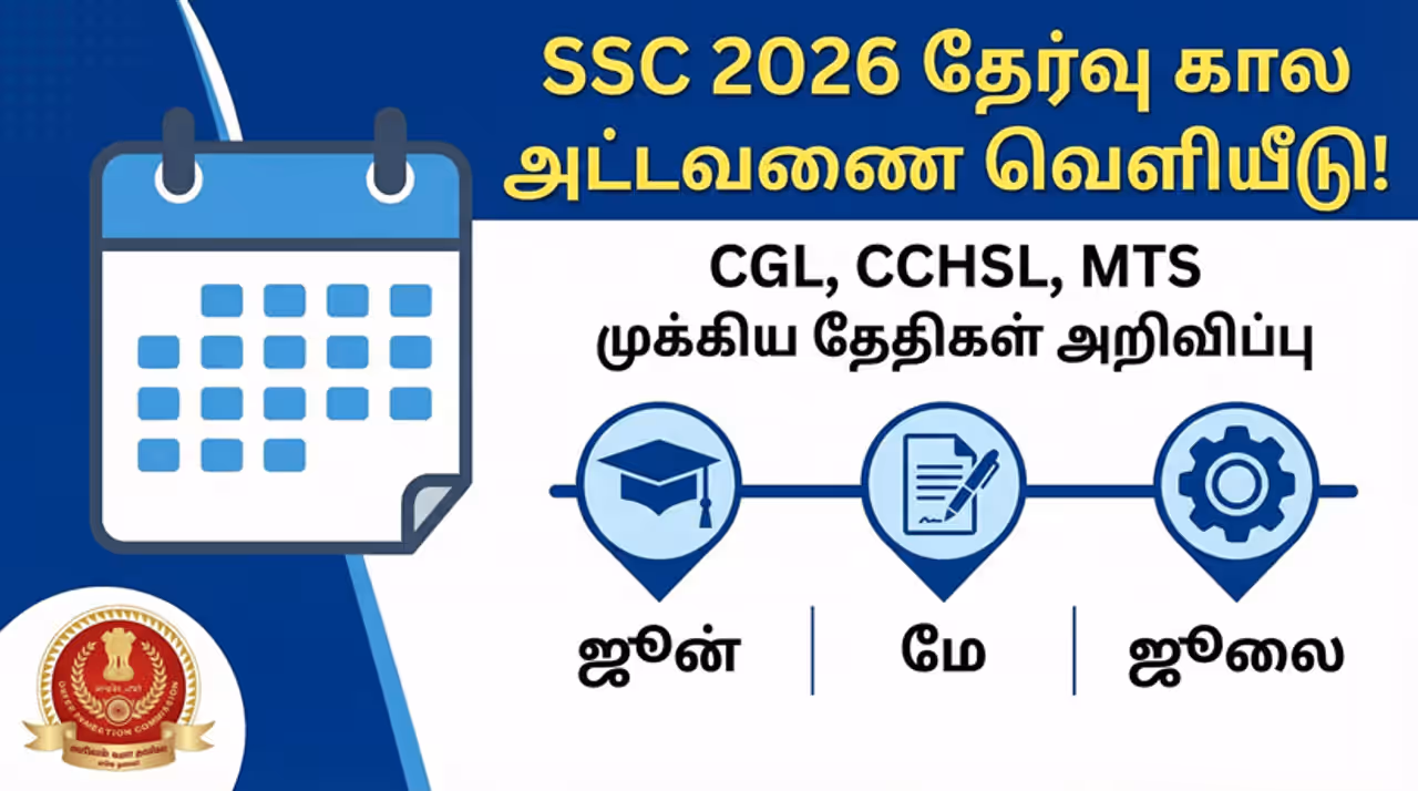 SSC Exam Calendar 2026-ஆம் ஆண்டிற்கான SSC தேர்வு கால அட்டவணை வெளியானது. CGL, CHSL, MTS மற்றும் கான்ஸ்டபிள் தேர்வுத் தேதிகளை இங்கே சரிபாருங்கள்.