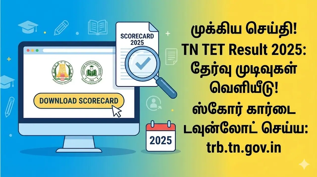 TN TET TN TET 2025 தேர்வு முடிவுகள் வெளியாகின. trb.tn.gov.in தளத்தில் ஸ்கோர் கார்டை பதிவிறக்கம் செய்யலாம். கட்-ஆஃப் மற்றும் முழு விவரங்கள் உள்ளே.