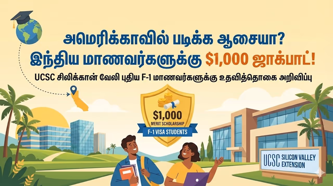 அமெரிக்காவின் கலிபோர்னியாவில் உள்ள புகழ்பெற்ற UCSC சிலிக்கான் வேலி எக்ஸ்டென்ஷன் (UCSC Silicon Valley Extension), சர்வதேச மாணவர்களுக்கான புதிய உதவித்தொகை திட்டத்தை அறிவித்துள்ளது. குறிப்பாக இந்திய மாணவர்கள் உட்பட, எஃப்-1 (F-1) விசா மூலம் புதிதாகச் சேரும் சர்வதேச மாணவர்களுக்கு இந்த "இன்டர்நேஷனல் ஸ்டூடன்ட் மெரிட் ஸ்காலர்ஷிப்" (International Student Merit Scholarship) வழங்கப்பட உள்ளது. சான்றிதழ் படிப்புகளை (Certificate Programs) மேற்கொள்ள விரும்பும் மாணவர்களுக்கு, அவர்களின் முதல் காலாண்டு கல்விக் கட்டணத்தில் $1,000 (சுமார் ரூ. 83,000) தள்ளுபடியாக இந்தத் தொகை வழங்கப்படும்.