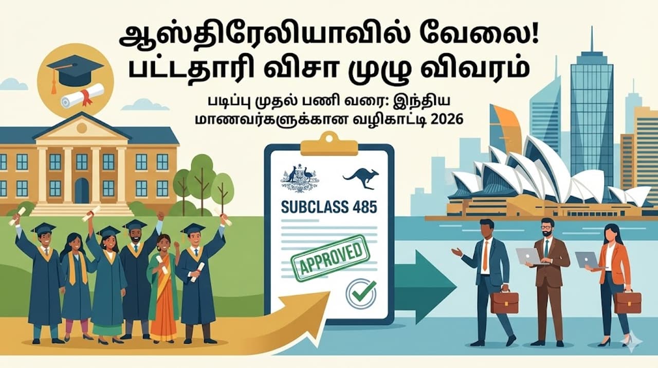 Australia ஆஸ்திரேலியாவில் படிப்பு முடித்த பின் வேலை செய்ய விரும்பும் இந்திய மாணவர்களுக்கான 'தற்காலிக பட்டதாரி விசா' (subclass 485) குறித்த முழுமையான வழிகாட்டி. தகுதி மற்றும் விண்ணப்பிக்கும் முறை பற்றி அறியவும்.
