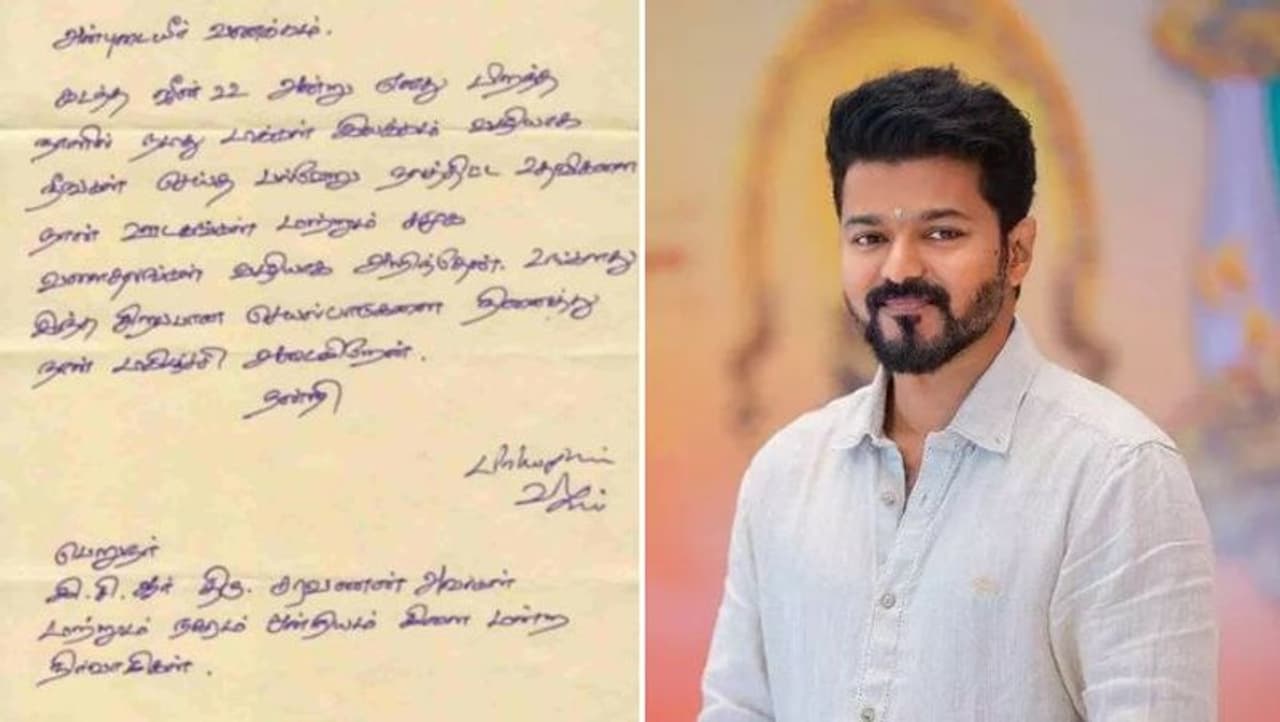 அந்த கடிதத்தில், ”கடந்த ஜூன் 22 அன்று, எனது பிறந்தநாளில் நமது மக்கள் இயக்கம் வழியாக நீங்கள் செய்த பல்வேறு நலத்திட்ட உதவிகளை நான் ஊடகங்கள் மற்றும் சமூக வலைதளங்கள் வழியாக அறிந்தேன். உங்களின் இந்த சிறப்பான செயல்பாடுகளை நினைத்து நான் மகிழ்ச்சி அடைகிறேன். பிரியமுடன் விஜய்” என்று எழுதியுள்ளார். இந்த கடிதம் இணையத்தில் தற்போது வைரலாகி வருகிறது.