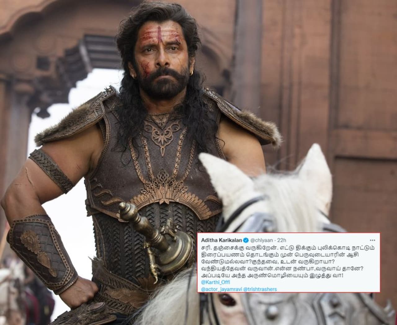 இதற்கு அழைப்பு விடுக்கும் விதமாக, ஆதித்த கரிகாலனாக மாறி நடிகர் விக்ரம் போட்ட டுவிட்டில், “சரி. தஞ்சைக்கு வருகிறேன். எட்டுத்திக்கும் புலிக்கொடி நாட்டும் திரைப்பயணம் தொடங்கும் முன் பெருவுடையாரின் ஆசி வேண்டுமல்லவா? குந்தவை, உடன் வருகிறாயா? வந்தியத்தேவன் வருவான். என்ன நண்பா, வருவாய் தானே? அப்படியே அந்த அருண்மொழியையும் இழுத்து வா என பதிவிட்டு கார்த்தி, திரிஷா, ஜெயம் ரவி ஆகியோரை டேக் செய்திருந்தார் விக்ரம்.