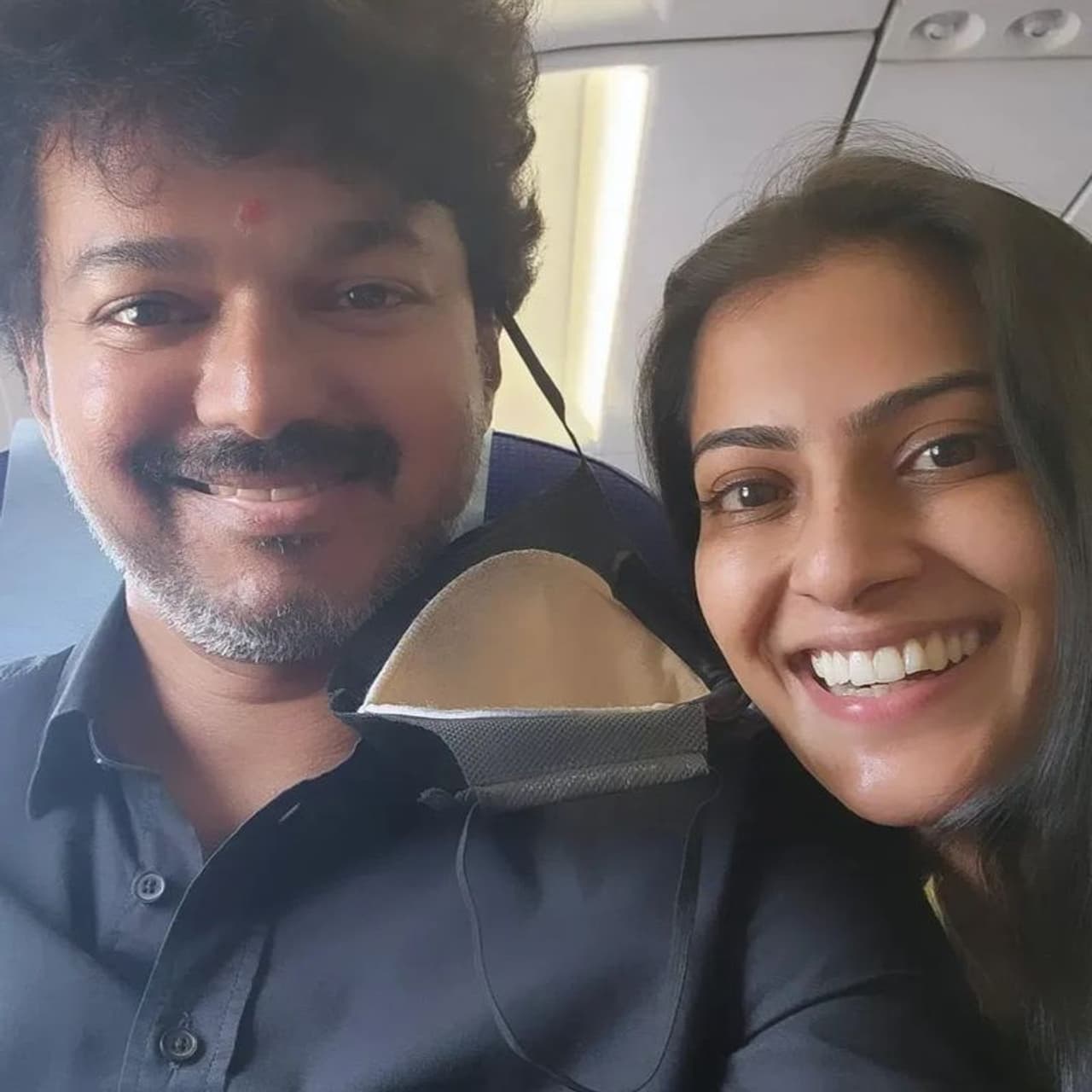 தளபதி விஜயுடன் விதவிதமாக விமானத்தில் பறந்தபடி எடுத்து கொண்ட செல்ஃபி புகைப்படங்களை வெளியிட்டு, இவ்வளவு நல்ல விமான பயணத்தை தான் அனுபவித்தது இல்லை என்றும், இன்றைய நாள் மிகவும் மகிழ்ச்சியாக அமைந்ததாக தெரிவித்துள்ளார். விஜய் தன்னுடைய பக்கத்திலேயே அமர்ந்து பயணித்தது குறித்தும் சமூக வலைத்தளத்தில் பதிவிட்டுள்ளார்.