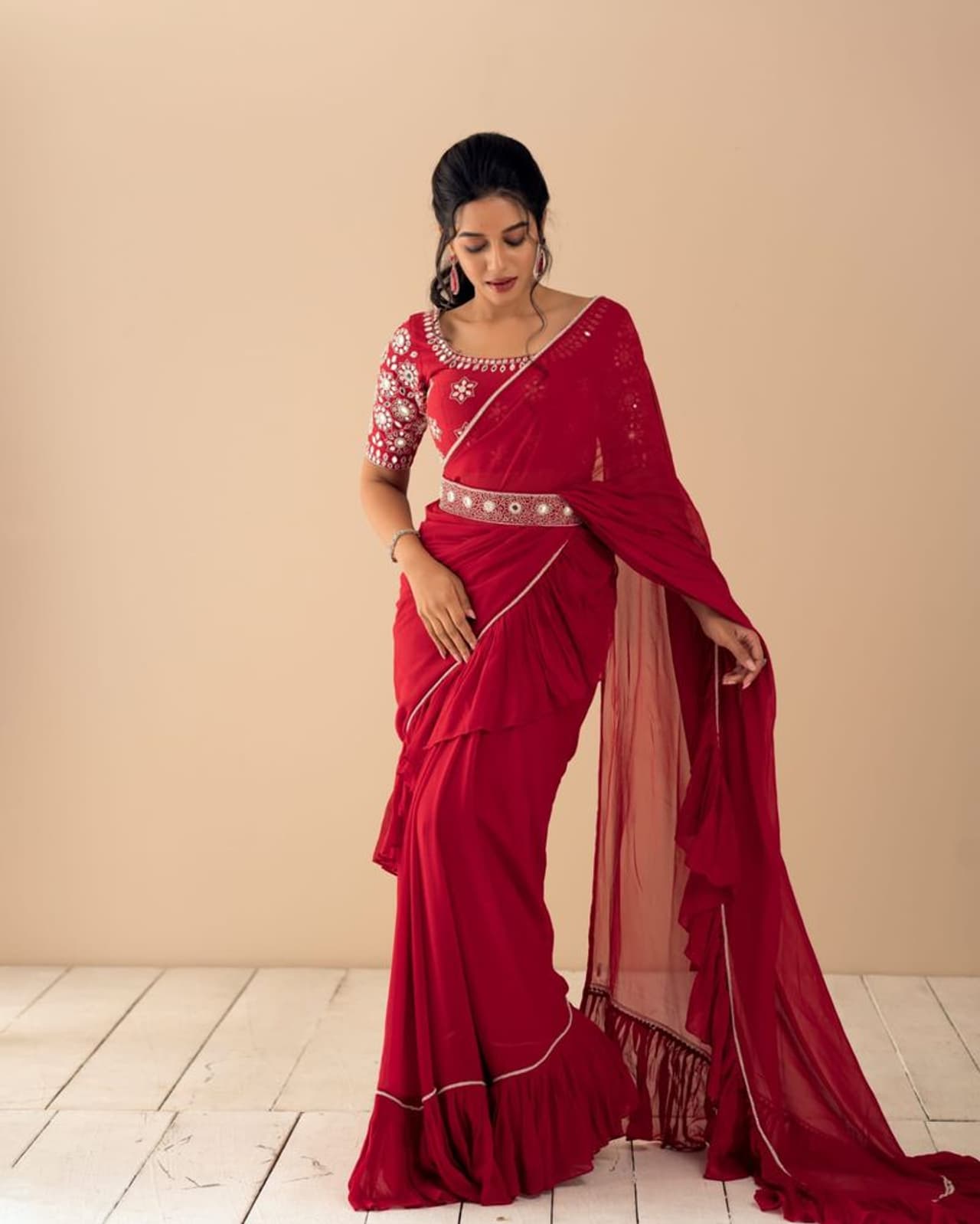 அந்த வகையில் தற்போது செக்கச் சிவந்த சேலையில் வளைந்து நெளிந்து போஸ் கொடுத்தபடி அவர் வெளியிட்டுள்ள புகைப்படங்கள் இணையத்தில் படு வைரல் ஆகி வருகிறது.
