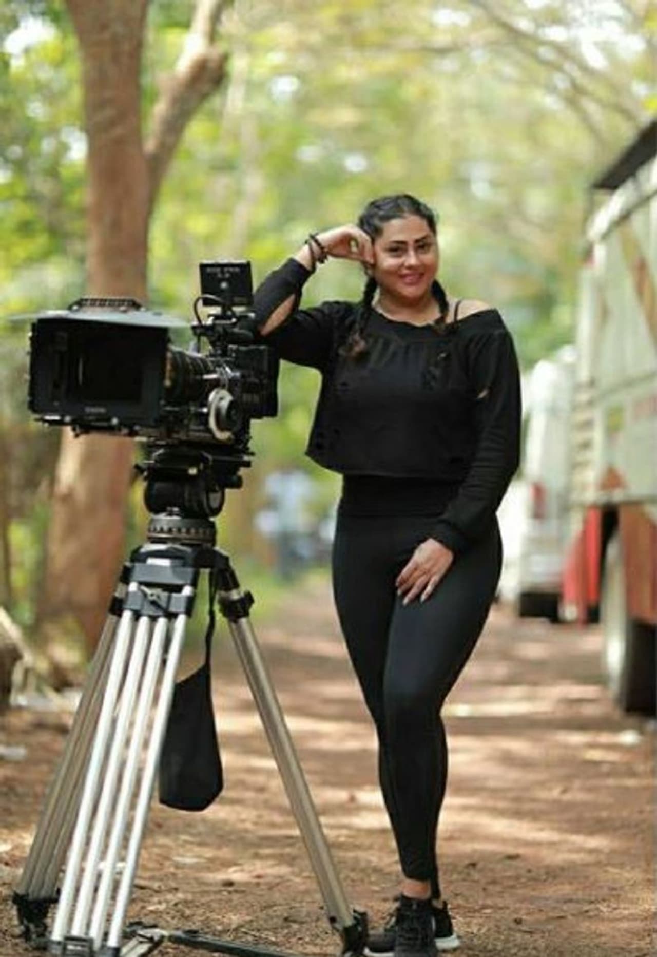 பட பிடிப்பில் அழகு தேவதையாக கேமரா பக்கத்தில் நின்று போஸ் கொடுக்கும் நமீதா