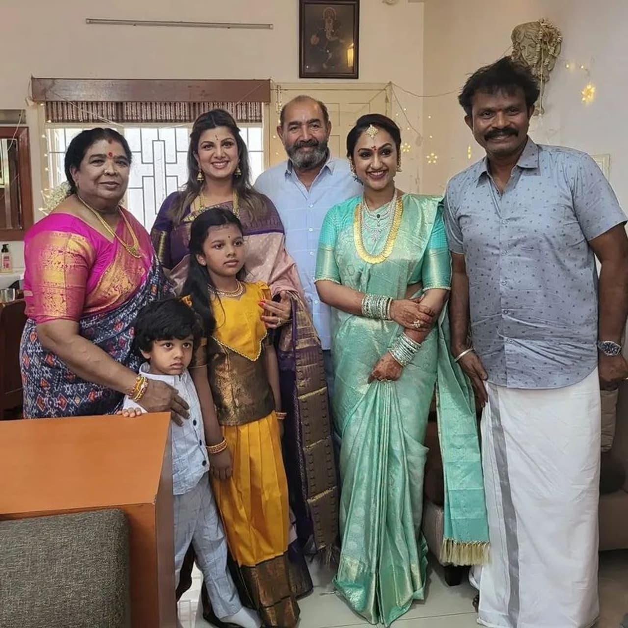 அழகிய பட்டு புடவையில் ரம்பா ஜொலிக்கிறார். அதே போல் இவருடைய மகன் மற்றும் மகள்களும் ஒரே மாதிரியான ட்ரெடிஷனல் பாவாடை சட்டையில் இருக்கின்றனர்.
