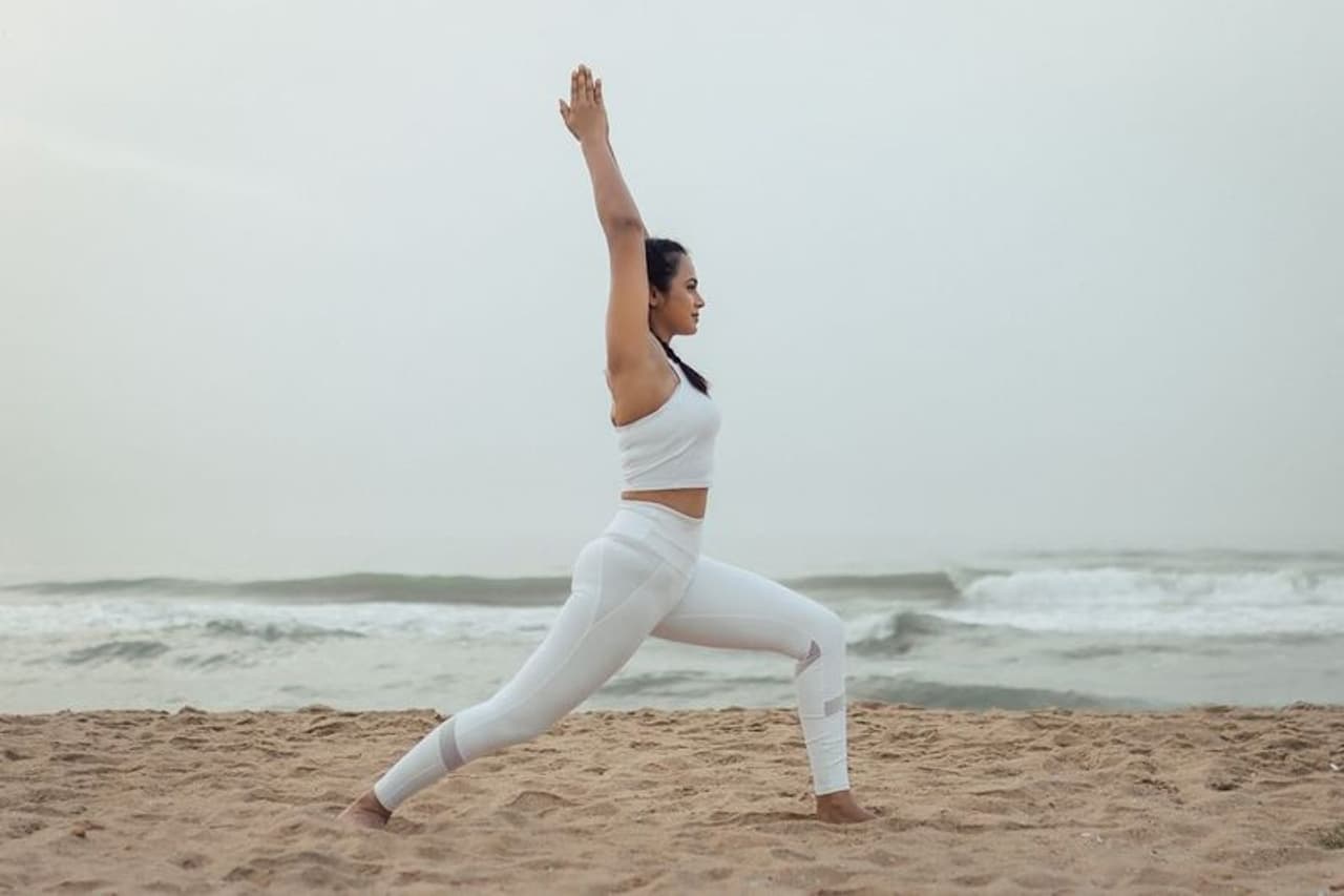 உடலை இறுக்கிப் பிடித்திருக்கும் வெள்ளை நிற டைட் உடையில் கடற்கரை மணலில் அமர்ந்த படி செம்ம ஆக்டிவாக யோகா செய்து அசத்தியுள்ளார்.