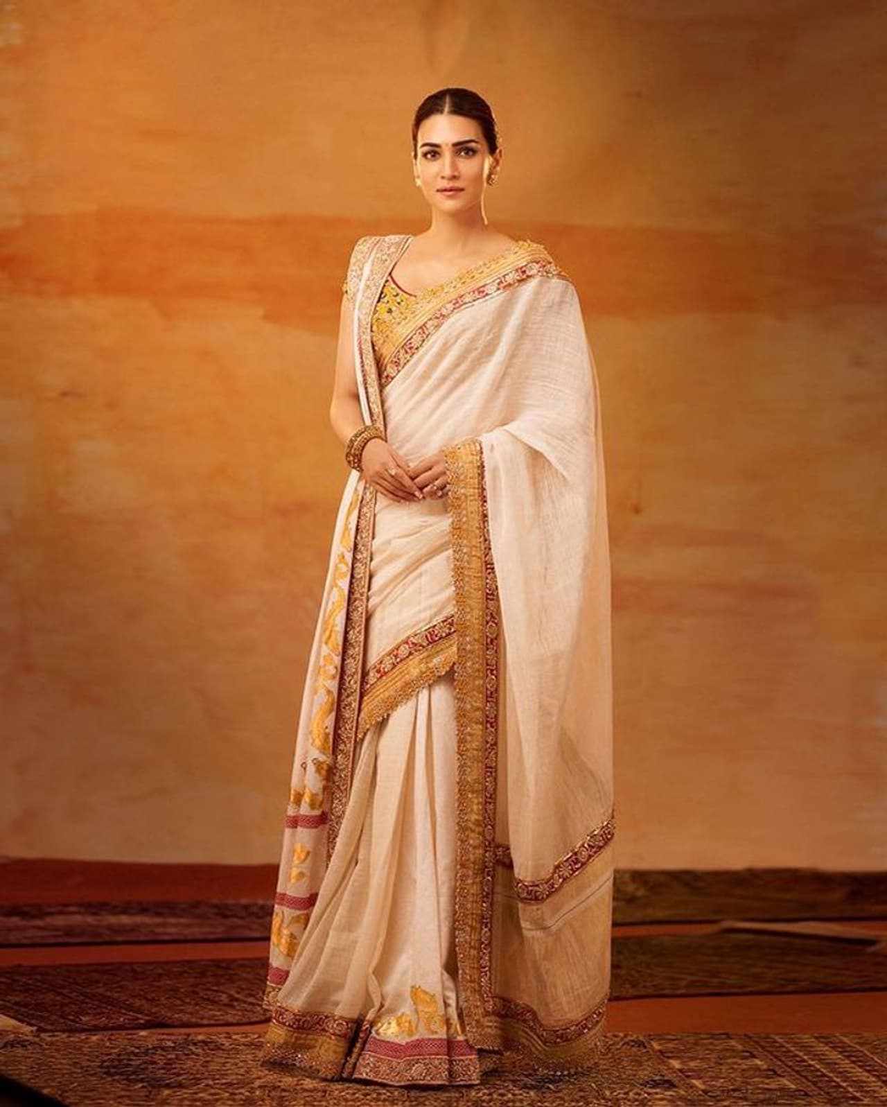 அதன்படி கீர்த்தி சனோன் அணிந்து வந்திருந்த சேலை 24 கேரக்ட் தங்கம் கலந்து உருவாக்கப்பட்டதாம். அவர் அணிந்திருந்த பிளவுஸில் மரகத கற்கள் டிசைனுக்காக பயன்படுத்தப்பட்டு இருந்ததாகவும், சீதையின் தூய்மையை பறைசாற்றும் விதமாக தூய துணிகளைப் பயன்படுத்தி இந்த சேலையை தயார் செய்ததாக அதன் டிசைனர்கள் தெரிவித்துள்ளனர். இந்த சேலையின் விலையை அவர்கள் வெளியிடாவிட்டாலும், இதன் மதிப்பு நிச்சயம் ரூ.10 லட்சத்திற்கு மேல் இருக்கும் என கூறப்படுகிறது.