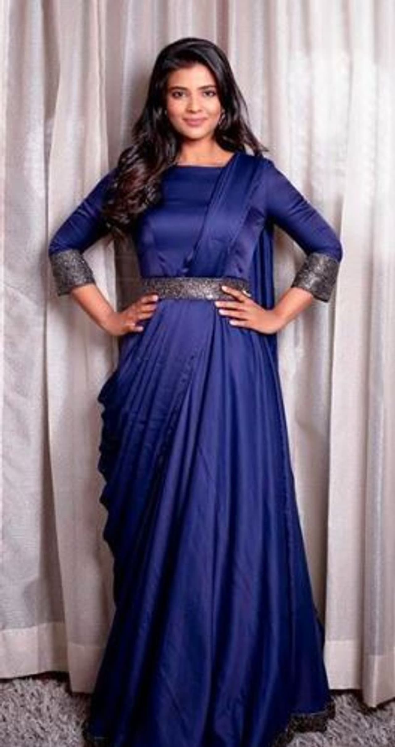 நீல நிற உடையில் இடுப்பில் கை வைத்து போஸ்
