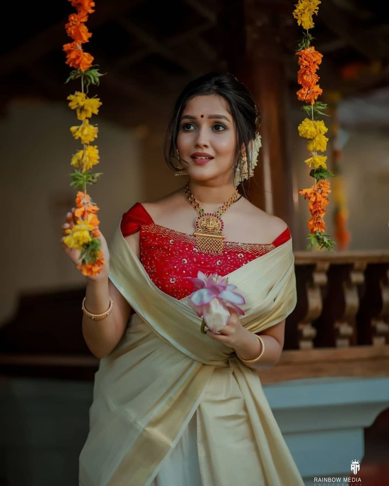 கையில் தாமரை பூ... வித்தியாசமாக கேரளா சேலை கட்டி ஹீரோயிகளையே கதிகலங்க வைத்த அனிகா!!