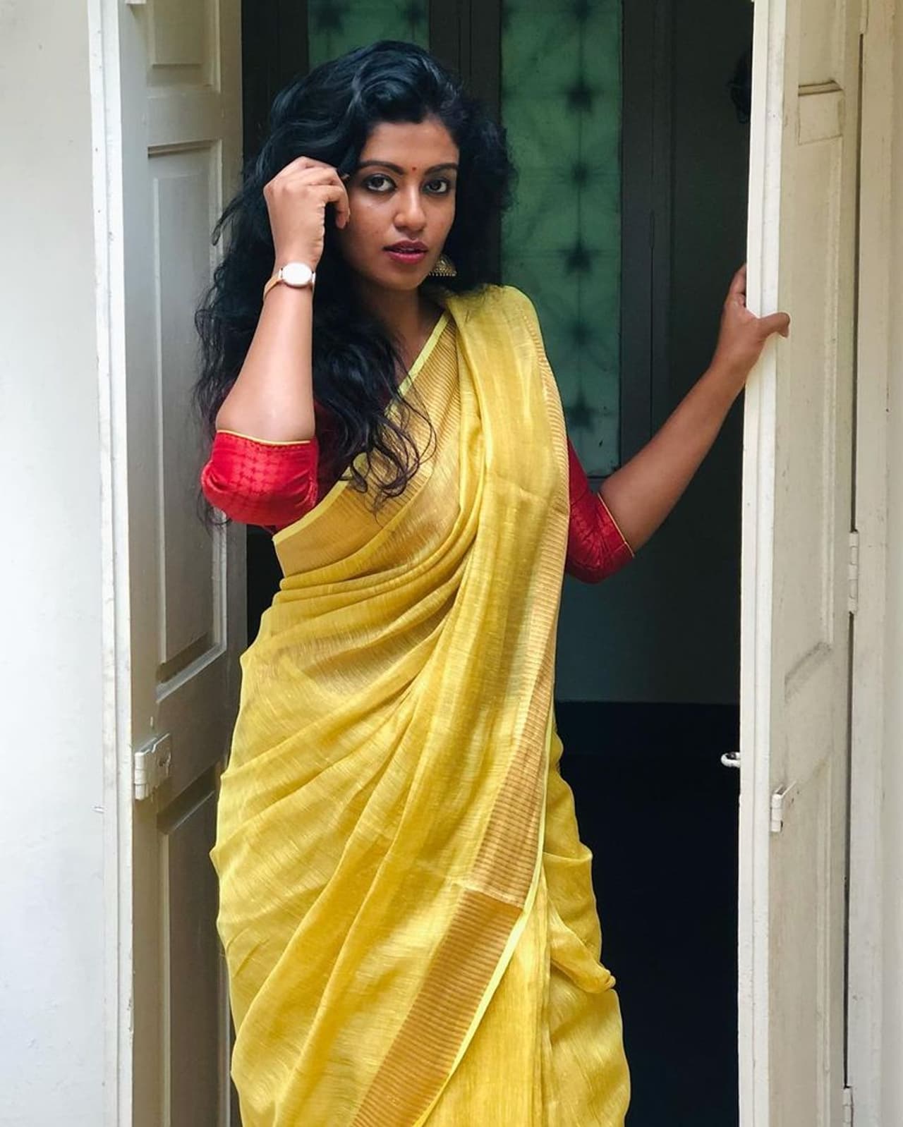மஞ்சள் நிற சேலையில் தினுசு தினுசாக போஸ்