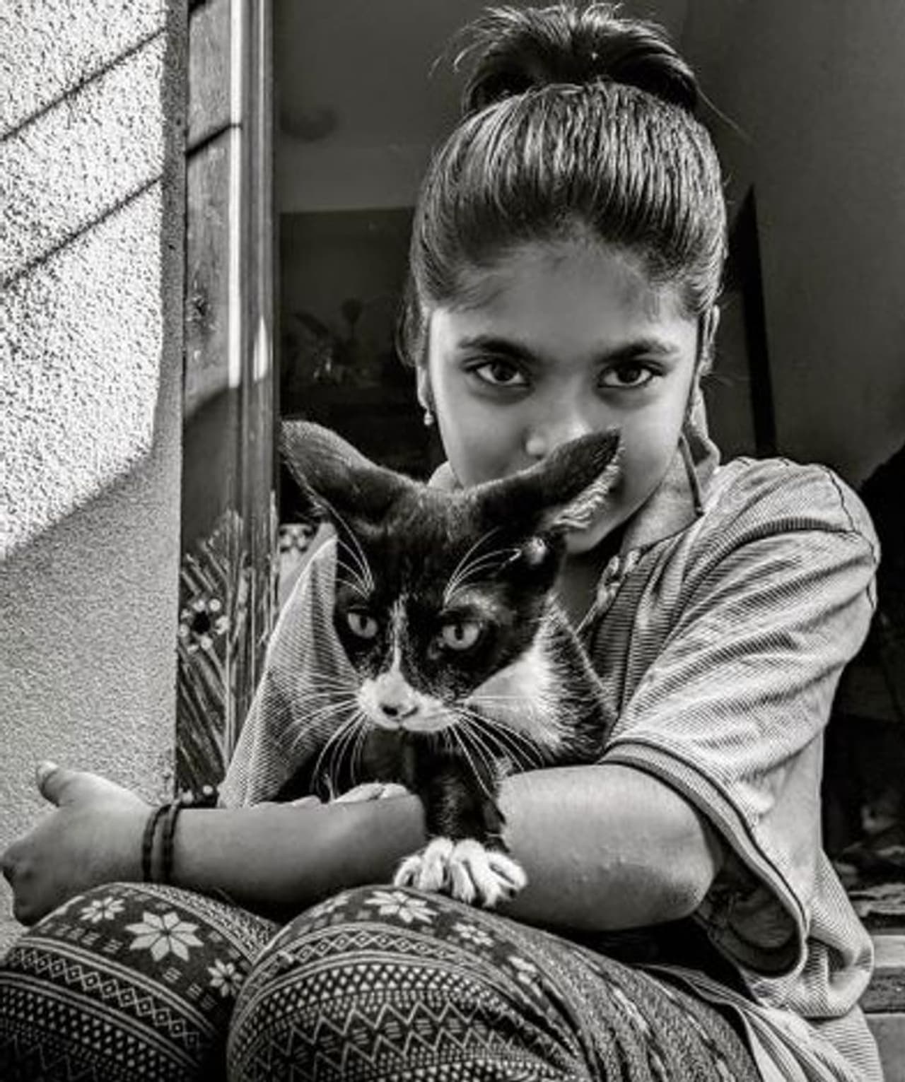 விலங்குகள் மீது அதீத பாசத்தோடு பூனையை கையில் பிடித்திருக்கும் பிரேம்குமார் மகள்