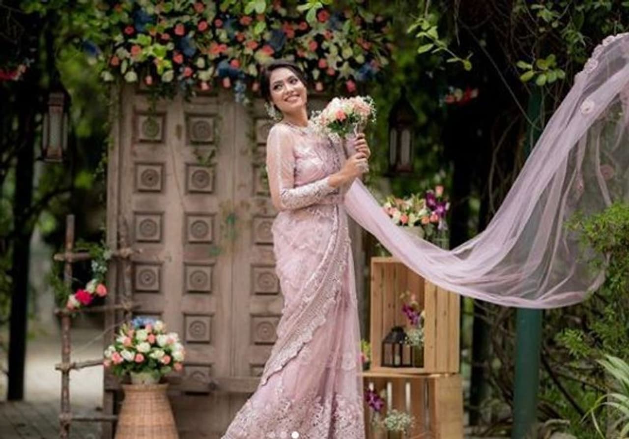 கையில் பூ கொத்துடன் திருமணத்திற்கு தயாராக உள்ளது போல் போஸ்