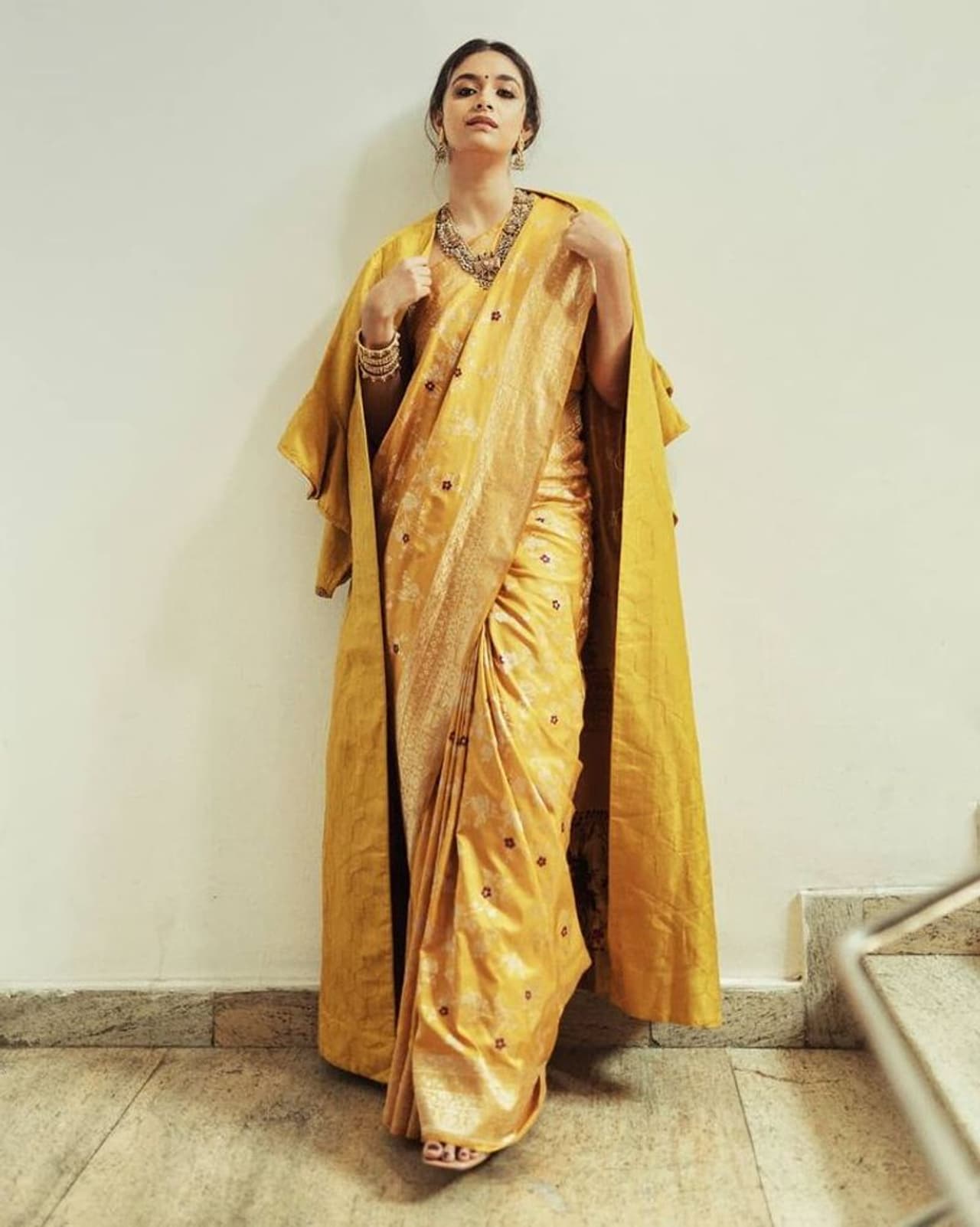 பட்டு சேலை மீது பக்கா ஸ்டைலிஷான தங்க நிற கோட்... வித்தியாசமான அவுட் ஃபிட்டில் தெறிக்கவிடும் கீர்த்தி சுரேஷ்..!