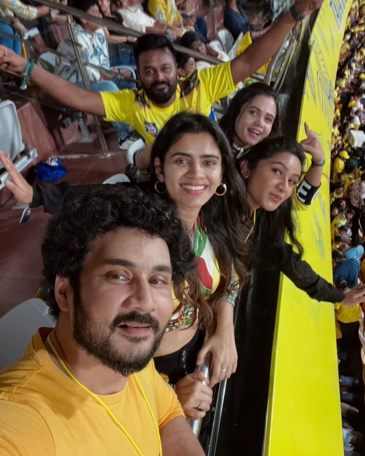 அதேபோல் நேற்றைய போட்டியை காண ரசிகர்கள் படையெடுத்து வந்ததால் சேப்பாக்கம் ஹவுஸ் புல் ஆனது. இந்த போட்டியை காண பிரபலங்கள் சிலரும் வருகை தந்திருந்தனர். அந்த வகையில் நடிகை திரிஷா தன்னுடைய தோழிகளான அர்ச்சனா கல்பாத்தி உள்பட சிலருடன் வந்து போட்டியை கண்டுகளித்தார். அதேபோல் பிக் பாஸ் பிரபலங்களான விஷ்ணு விஜய், செளந்தர்யா, ரவீனா, யாஷிகா ஆனந்த் ஆகியோருடன் விஜே மணிமேகலை, ஹுசைன் ஜோடியும் வந்து சிஎஸ்கே போட்டியை கண்டுகளித்துள்ளனர். அப்போது எடுக்கப்பட்ட புகைப்படங்கள் இணையத்தில் வைரலாகி வருகிறது.