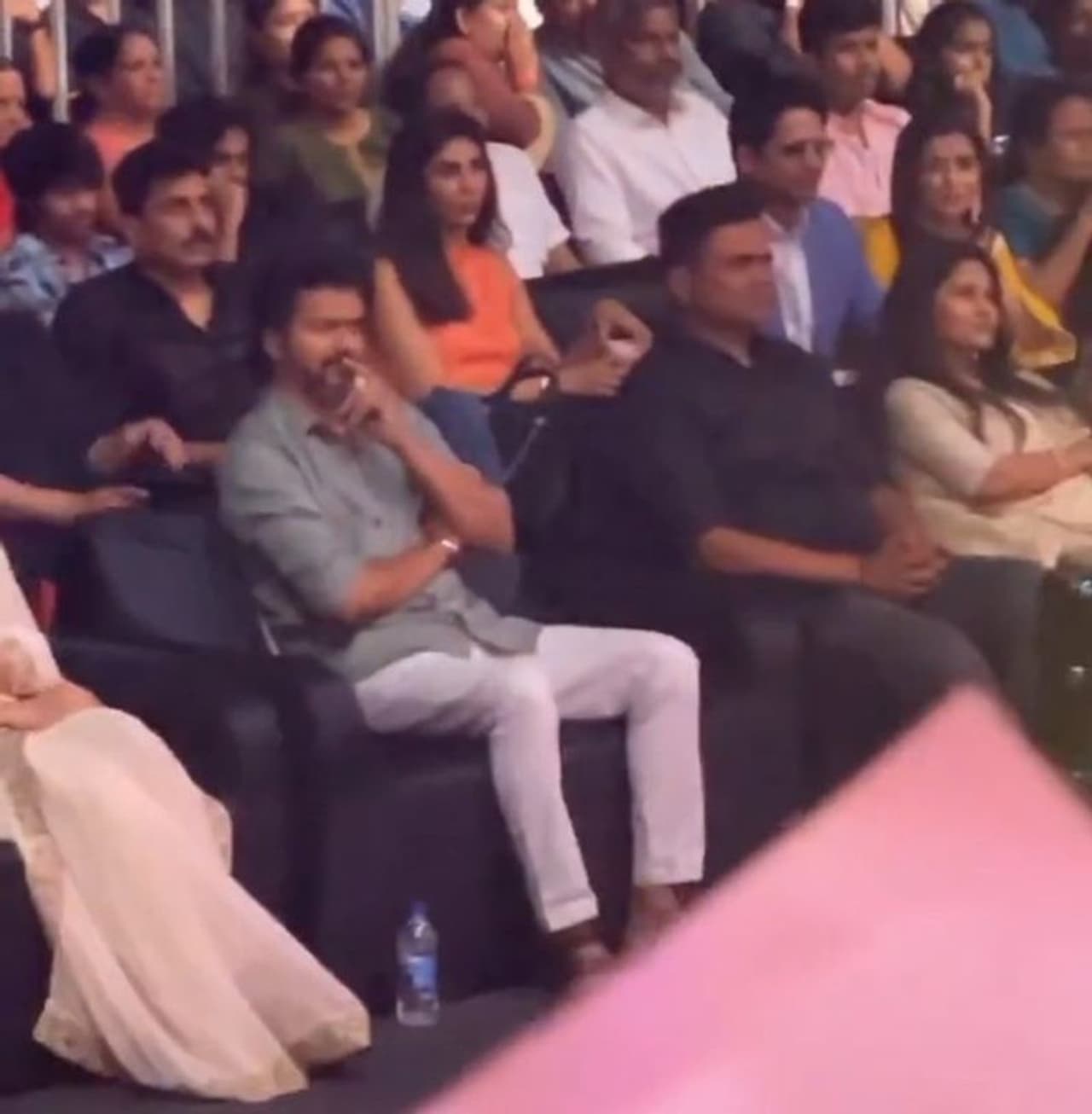 விஜய் நடிப்பில் உருவாகியுள்ள 'வாரிசு' படத்தின் இசை வெளியீட்டு விழா மிக பிரமாண்டமாக தற்போது சென்னை நேரு உள்விளையாட்டு அரங்கில் நடந்து வரும் நிலையில், இதில் இந்த படத்தில் நடித்துள்ள பிரபலங்கள் மட்டும் இன்றி, ஏகப்பட்ட ரசிகர்கள் கலந்து கொண்டு சிறப்பித்துள்ளனர். குறிப்பாக நடிகர் விஜய் இந்த ஆடியோ வெளியீட்டு விழாவில், என்ன பேசுவார் என்பதை கேட்பதற்காகவே பல ரசிகர்கள் போட்டி போட்டு கொண்டு, ஆடியோ வெளியீட்டு விழாவிற்கு வருகை தந்துள்ளனர்.