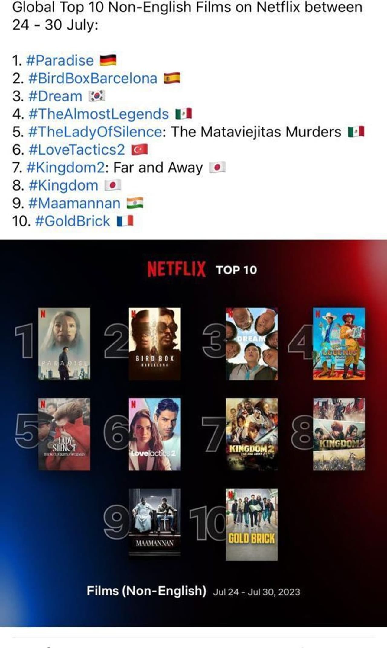 ரெட் ஜெயன்ட் மூவிஸ் தயாரிப்பில், இயக்குநர் மாரி செல்வராஜ் இயக்கத்தில், நடிகர் உதயநிதி ஸ்டாலின், வடிவேலு, பகத் பாசில், கீர்த்தி சுரேஷ் நடிப்பில், சமூக நீதி பேசும் மாபெரும் படைப்பாக உருவான திரைப்படம் மாமன்னன். சமீபத்தில் நெட்ஃபிளிக்ஸ் தளத்தில் வெளியான இப்படம் இந்திய அளவில் நம்பர் 1 இடத்தை பிடித்ததோடு, உலகளவில் 1.2 மில்லியன் பார்வைகளைக் குவித்து சாதனை படைத்துள்ளது.