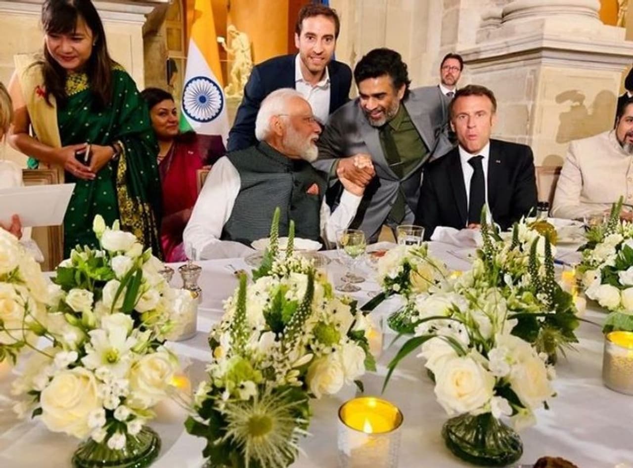 பிரான்ஸ் அதிபர் இமானுவேல் மேக்ரான் கொடுத்த இந்த விருந்தில் நடிகரும், இயக்குனருமான மாதவனும் கலந்துகொண்டார். அப்போது ஒரு அழகிய தருணமும் நிகழ்ந்தது. பிரான்ஸ் அதிபரும், இந்திய பிரதமர் மோடியும் உணவருந்தியபடியே உரையாடிக் கொண்டிருந்த போது, அங்கு சென்ற மாதவன், இருவருடனும் செல்பி எடுக்க வேண்டும் என தனது விருப்பத்தை தெரிவித்தார்.
