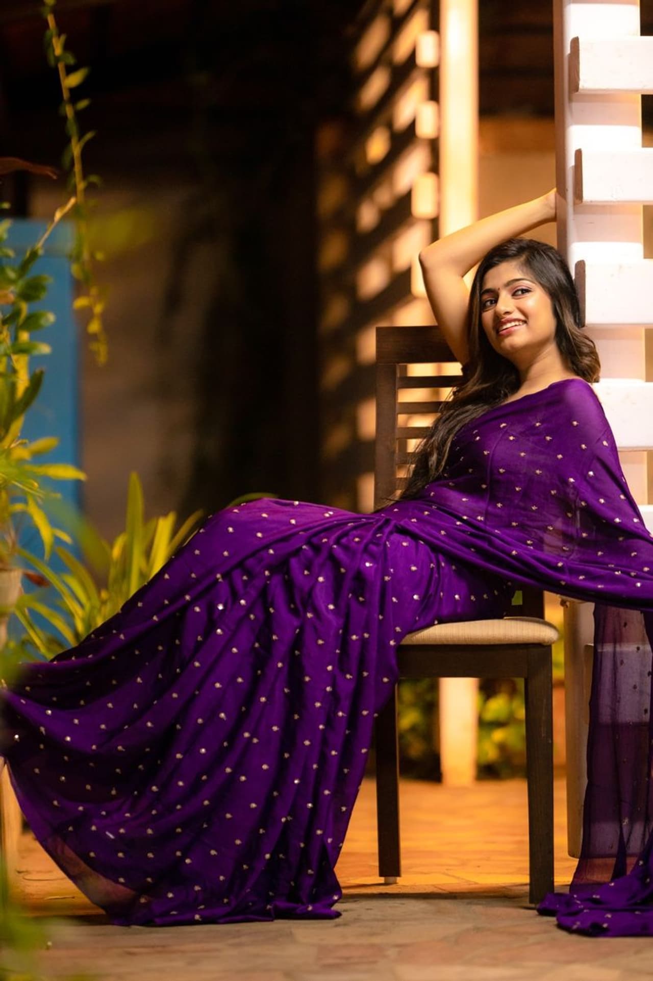 இந்நிலையில் இவர் ரசிகர்களை கவர்ந்திழுக்கும் விதமாக, ஊதா நிற சேலையில்... வெளியிட்டுள்ள லேட்டஸ்ட் புகைப்படங்கள் தற்போது சமூக வலைத்தளத்தில் வைரலாக பார்க்கப்பட்டு வருகிறது.