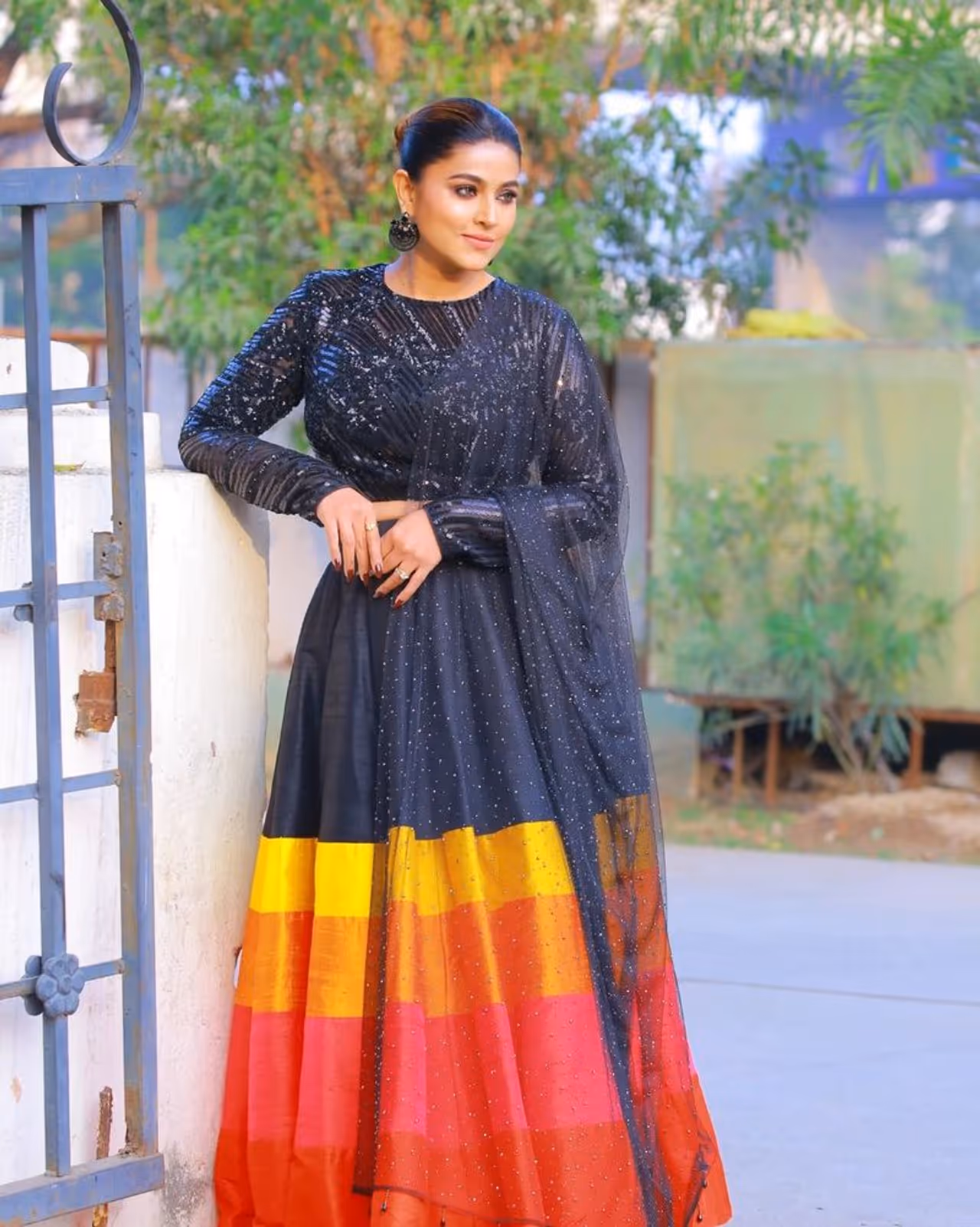 போட்டிருக்கும் குட்டை கிராப் டாப்புக்கு ஏற்றாப்போல், கருப்பு நிற லாங் ஸ்கடர்ட் அணிந்துள்ளார். இதில் இதில் கோல்டன், மஞ்சள், பிங்க், ஆரஞ்சு, போன்ற நீண்ட பார்டர்கள் உள்ள.