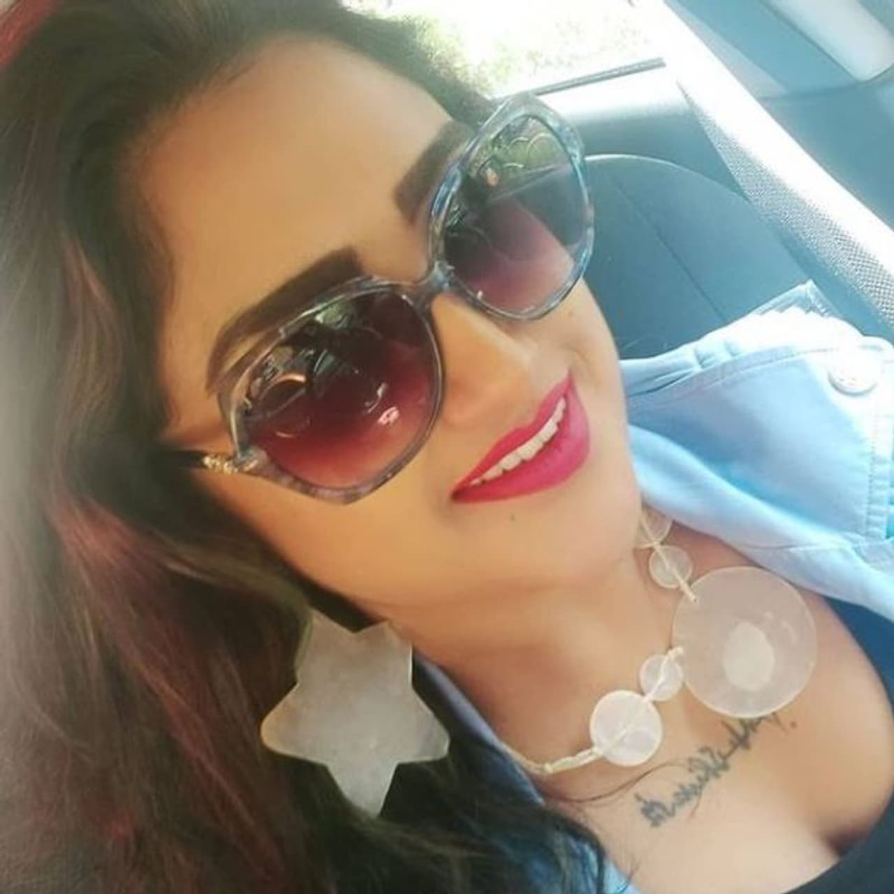 ஜொலிஜொலிக்கும் பிங்க் நிற லிப்ஸ் ஸ்ட்ரிக், புருவத்தில் நீல நிற ஷாடோ என வித்தியாசமாக இருக்கிறது.