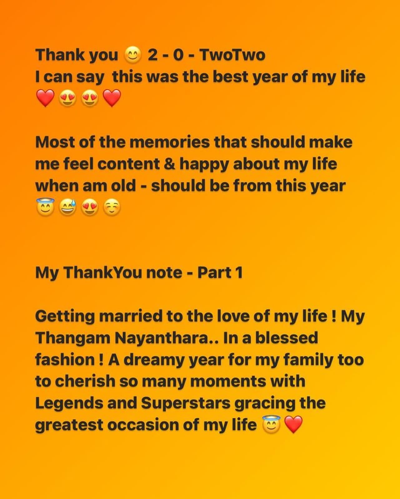 நடிகையும், தன்னுடைய காதலியான நயன்தாராவை அனைவரின் ஆசீர்வாதத்துடன் கரம் பிடித்ததாகவும், இதில் பல லெஜெண்ட்ஸ் மற்றும் சூப்பர் ஸ்டார்கள் கலந்து கொண்டு வாழ்த்தியதை குறிப்பிட்டுள்ளார்.
