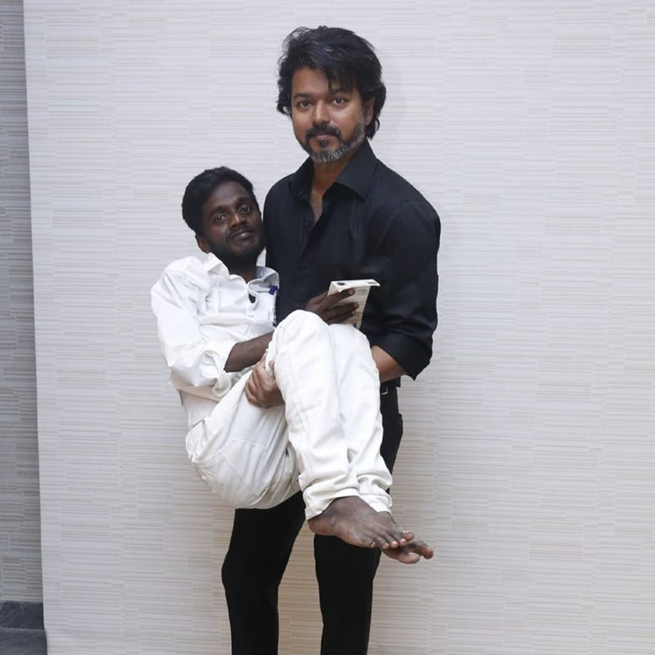 - நிற்க முடியாத மாற்று திறனாளி ரசிகரை... குழந்தை போல் கையில் ஏந்தியபடி போஸ் கொடுத்த விஜய்! வைரலாகும் புகைப்படம்!