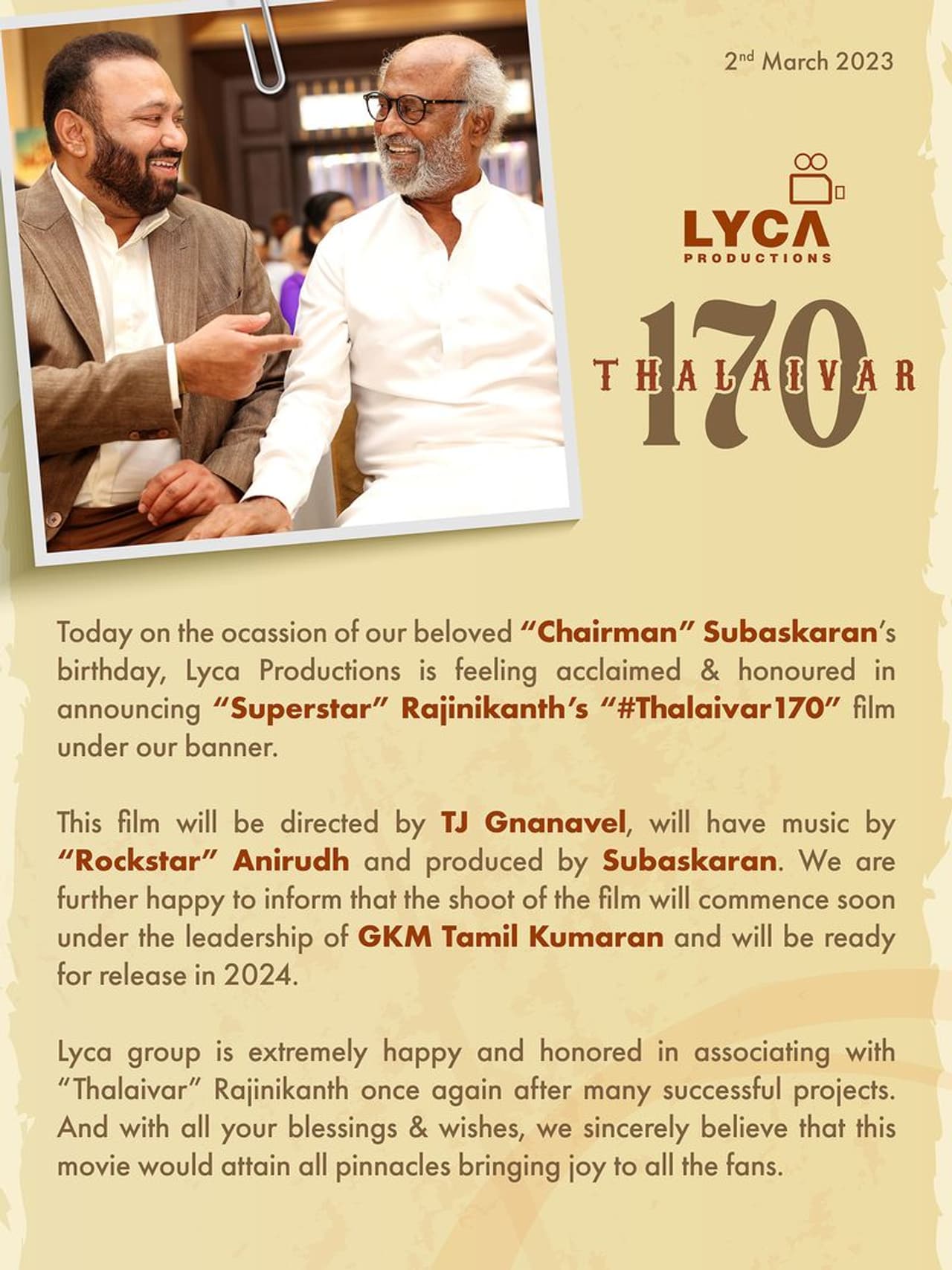 'ஜெயிலர்' படத்தின் வெற்றியால், மிகவும் உற்சாகமாக இருக்கிறார் சூப்பர் ஸ்டார் ரஜினிகாந்த். இந்த படத்தை தொடர்ந்து இவரின் 170-ஆவது படத்தை, இயக்குனர் TJ ஞானவேல் இயக்க உள்ளார். இந்த படத்தின் படப்பிடிப்பு, அக்டோபர் 4 ஆம் தேதி திருவனந்தபுரத்தில் துவங்க உள்ளதாக கூறப்படுகிறது.