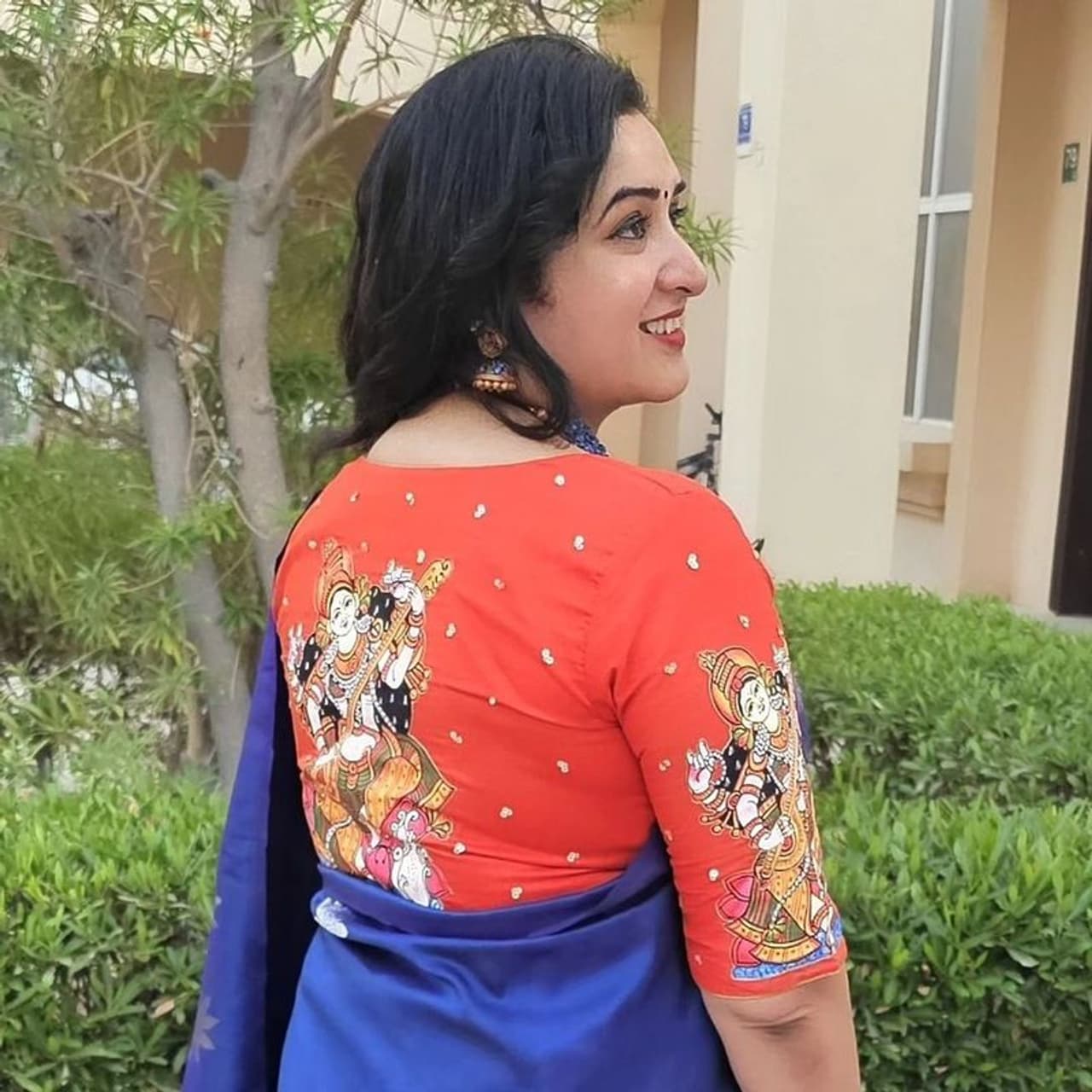 இன்றைய தினம் நீல நிற பட்டு புடவையில்... சரஸ்வதி தேவியின் உருவம் பாதிக்கப்பட்ட ஜாக்கெட்டில், கழுத்தில் விநாயகர் டாலர் வைத்த மாலை அணிந்துள்ளார். இந்த புகைப்படங்கள் தற்போது வைரலாக பார்க்கப்பட்டு வருகிறது.